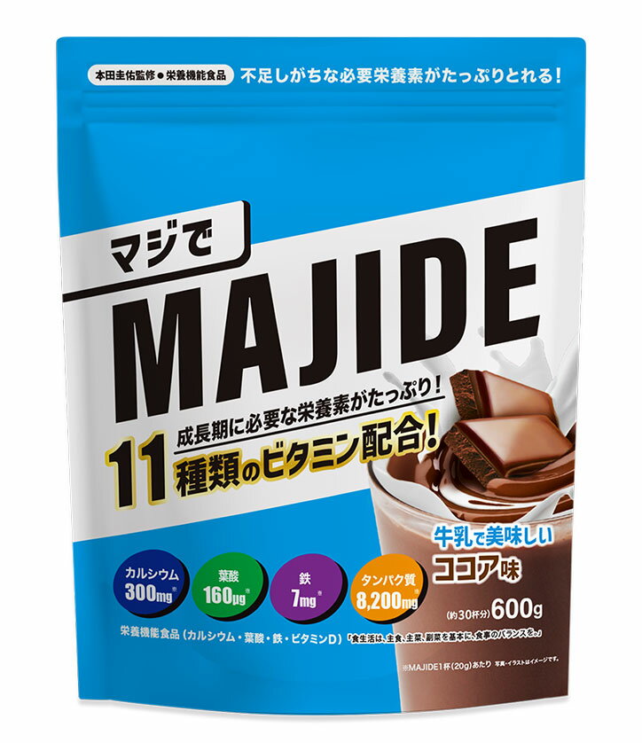 メーカー希望小売価格はメーカーカタログに基づいて掲載していますメーカー希望小売価格はメーカー商品タグに基づいて掲載しています 商品詳細ジュニア向けプロテイン「マジで(MAJIDE)」。 本田圭佑氏が選手・指導者として感じた幼児期・成長期の栄養管理の重要性・課題を落とし込み、「本気で」開発したジュニア向けプロテイン。すべての子どもたちが健康課題なく運動や学習に取り組めるように、価格にもこだわり、平等に持つ「伸びしろ」を無限大の可能性に変える、厚生労働省が定める基準を満たした栄養機能食品。 ◆安心の国内製造 ◆植物由来の甘味料「ステビア」のみ使用 ◆こだわりの美味しさ ◆健康的な成長をサポート(健康な身体作りに必要な「たんぱく質」「カルシウム」「ビタミンD」「ビタミンA」「鉄」) ◆野菜嫌い・お菓子を食べがちな子供へ(「ビタミン」「ミネラル」など豊富な栄養素) ◆集中力アップ(運動や勉強に必要とするエネルギー「糖質」「ビタミンB1」「ビタミンB2」「ナイアシン」) ◆免疫機能アップ(「ビタミンA」「ビタミンC」「ビタミンD」など11種類のビタミン) 内容量:600g(30回分) モデル:2025年春夏
