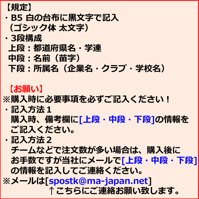 ソフトテニス用 ゼッケン ソフトテニスの試合には欠かせないゼッケンです。 平成29年度日本ソフトテニス連盟の規定に沿ったゼッケンをお作りします。 【規定】 ・B5版 白の台布に黒文字で記入(ゴシック体 太文字) (当店のB5版は現在25cm×20cmの台布となっております。日本ソフトテニス連盟に確認してこのサイズでも許容範囲とご回答いただいておりますのでそのまま切らずに使用可能です。) ・3段構成 上段:都道府県名・学連 中段:名前(苗字) 下段:所属名(企業名・クラブ・学校名) 【お願い】 ※購入時に必要事項を必ずご記入ください! ・記入方法1 購入時、備考欄に[上段・中段・下段]の情報をご記入ください。 ・記入方法2 チームなどで注文数が多い場合は、購入後にお手数ですが当社にメールで[上段・中段・下段]の情報を記入してご連絡ください。 ※メールは[spostk@ma-japan.net]←こちらにご連絡お願い致します。 【ゼッケンの詳細・注意】 ・ゼッケンはマラソン、陸上、ソフトテニス、卓球、空手等、様々なスポーツに使用できるほつれ防止タイプのインクジェットゼッケンクロスを使用します。 ・耐水性、耐久性があり破れにくい、ポリエステル布地のゼッケンクロスとなっております。 (紙に似た質感ですが和紙ではございません。) ・インクジェットゼッケンクロスにプリントし発送いたします。 ・万一ほつれが出た場合はハサミなどでカットしてください。 ・洗濯はできません。 ・ユニホームに縫い付けて使用することはできません。 ・汗や雨に濡れても色落ちしにくくなっておりますが、擦れに弱く、長年使用されますと色落ちやシワが付いてきますのでご了承ください。 ※あくまで簡易ゼッケンとしての使用をおすすめ致します。 洗濯や長期で使用されるゼッケンをお求めのお客様は布タイプをおすすめします。 ※布タイプのゼッケンはこちら←←← ・3枚以上購入でメール便で送料無料!(日時指定はできません。) 通常宅配便をご希望の場合は通常宅配便の送料600円をいただきます。 ・10枚以上で通常宅配便も送料無料!(日時指定できます。) <メール便をご希望の方はこちらをご確認ください。> ※システム上楽天より配信されるご注文受付メールには3枚購入しても送料が220円と表記される場合がございます。 その場合は、当店よりご注文確認後に送料を訂正し改めてメールにてご請求金額のご連絡を差し上げます。 ご迷惑をおかけしますがよろしくお願いします。 ※納期:即日~2日以内に発送![土日祝日を除く] ネーム加工につき、ご注文後の返品・交換・キャンセルはできません。