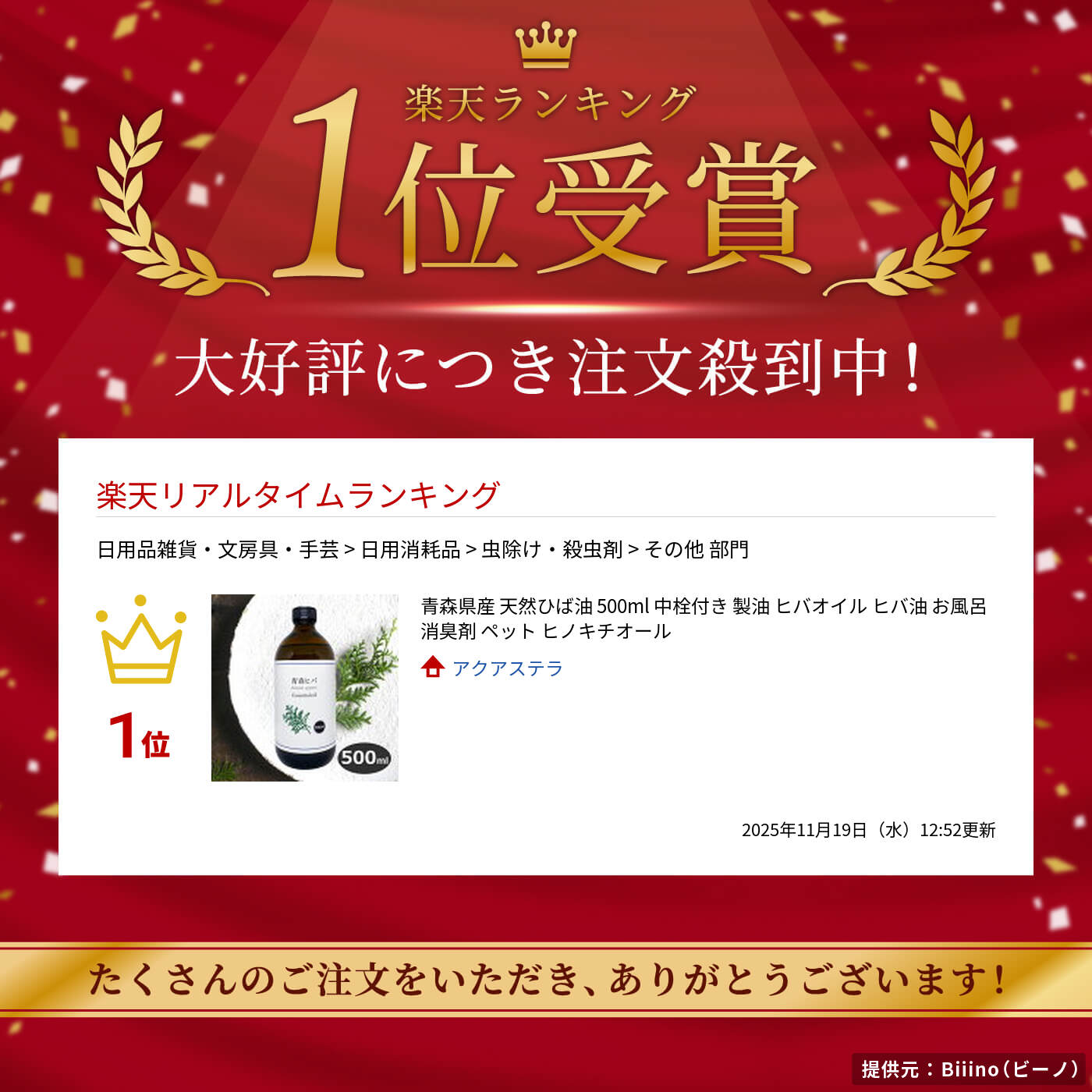 青森県産 天然ひば油 500ml 中栓付き 製油 ヒバオイル ヒバ油 お風呂 消臭剤 ペット ヒノキチオール