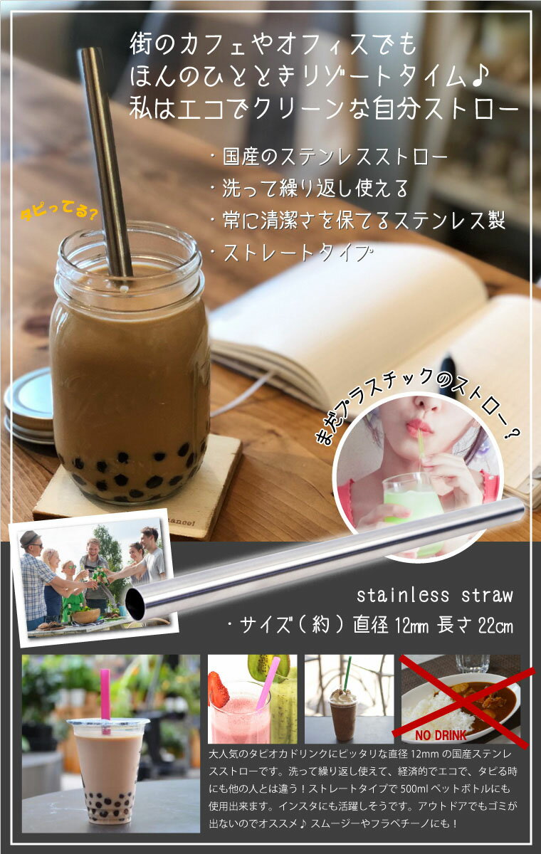 Sin ステンレス タピオカストロー 3本セット 直径12mm×長さ220mm (約) ストレートタイプ 日本製 エコ 洗って使える 清潔 再利用 ステンレス製 タピオカ用ストロー クリックポスト発送