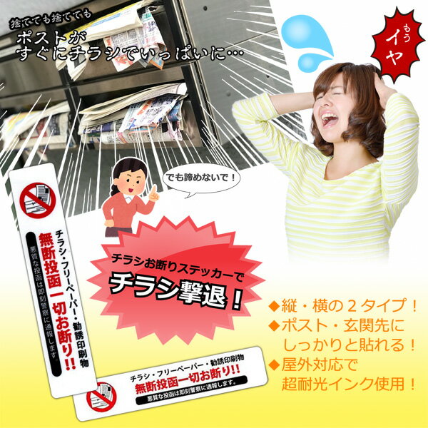 チラシ お断り ステッカー 1枚入り 30×150mm 勧誘印刷物の無断投函防止に チラシや勧誘印刷物の投函を抑止するステッカーです。 ポストや玄関先にもしっかり貼ることができます。 屋外の使用を考えて超対光インキを使用しています。 ・サイズ(約) 30×150mm ・広告文責 株式会社スポット TEL:06-6902-7681 ・販売元 株式会社アメージングクラフト ※PC環境などにより、画像と実際の商品とは多少色味が違う場合があります。ご了承ください。 ※予告なくパッケージ、デザイン、および仕様等が変更になる場合があります。ご了承ください。チラシ防止ステッカー ラインナップ チラシ お断り ステッカー 白 横タイプ シールタイプ マグネットタイプ チラシ お断り ステッカー 白 縦タイプ シールタイプ マグネットタイプ チラシ お断り ステッカー オールドブルー シールタイプ マグネットタイプ
