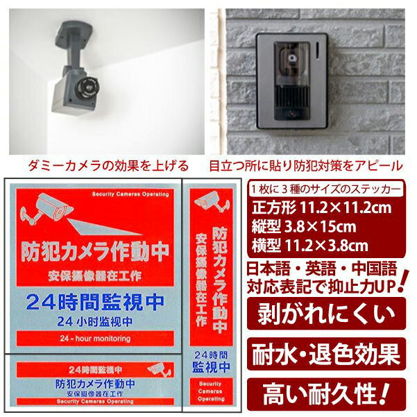 防犯カメラ ステッカー 8枚セット 正方形 縦型 横型 日本語 中国語 英語 対応 日本製 屋外 防犯カメラ作動中 シール 防犯効果を上げる視認性の高いステッカー。 お得8枚セットです。 目立つところに貼るだけで防犯効果がアップします。 侵入者に防犯意識が高いことをアピール! アルミ光沢を使用し赤をメインカラーとしてデザインしているため、遠くからでも目立ちます。 近年では空き巣犯等が多国籍化しています。日本語、中国語、英語の3ヵ国語で記載。 屋外でも劣化しにくい品質となっています。 ダミーカメラと一緒に使うと防犯効果がさらに上がります。 ※PC状況によって実際のお色と見え方が異なる場合がございますので、予めご了承くださいませ。※予告なくパッケージ・外観等変更になる場合がございますので予めご了承お願いいたします。 ・サイズ 15×15cm 1シートに3サイズのステッカー 縦型:3.8×15cm 横型:11.2×3.8cm 正方形:11.2×11.2cm ・使用上の注意 ・本製品は防犯、盗難防止商品ではございません。 万一、犯罪や盗難などの事件が起きた場合も責任は一切負いかねます。 ・本製品の貼り付け、剥がした場合の建物や住宅設備等への損害において一切の責任は負いかねますので、貼り付け前にテストを行ってください。 ・発売元 株式会社アメージングクラフト ・区分 日本製 ・広告文責 株式会社スポット TEL:06-6902-7681まとめて買うとお得です。 防犯カメラステッカー お試し用に 防犯カメラ ステッカー 1枚 正方形 縦型 横型 日本語 中国語 英語 対応 日本製 防犯カメラ ステッカー 2枚 セット 正方形 縦型 横型 日本語 中国語 英語 日本製 防犯カメラ ステッカー 4枚セット 正方形 縦型 横型 日本語 中国語 英語 日本製 防犯カメラ ステッカー 8枚 正方形 縦型 横型 日本語 中国語 英語 日本製