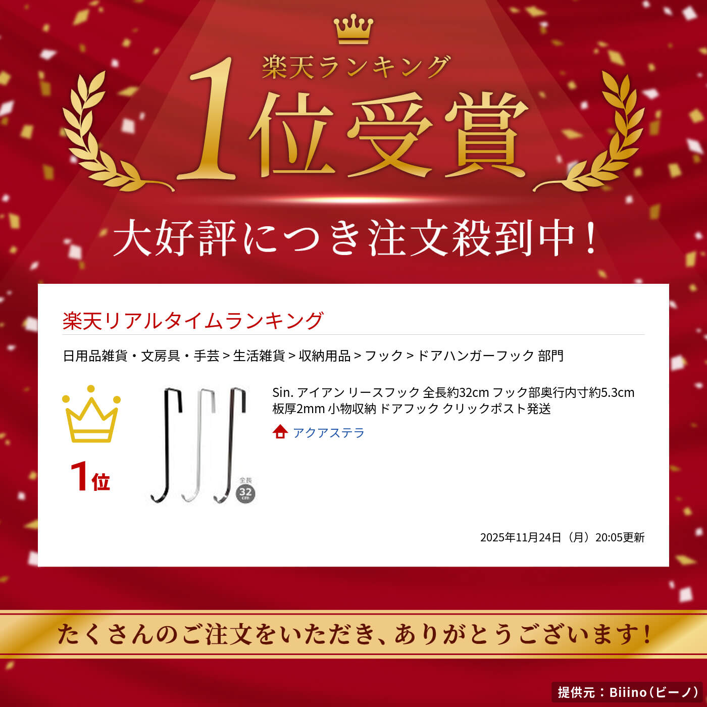 Sin. アイアン リースフック 全長約32cm フック部奥行内寸約5.3cm 板厚2mm 小物収納 ドアフック クリックポスト発送