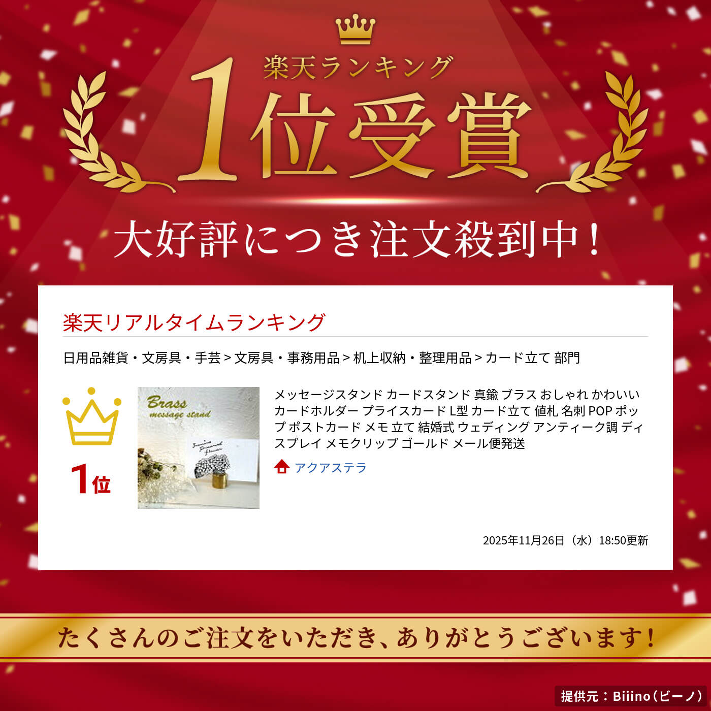 メッセージスタンド カードスタンド 真鍮 ブラス おしゃれ かわいい カードホルダー プライスカード L型 カード立て 値札 名刺 POP ポップ ポストカード メモ 立て 結婚式 ウェディング アンティーク調 ディスプレイ メモクリップ ゴールド メール便発送