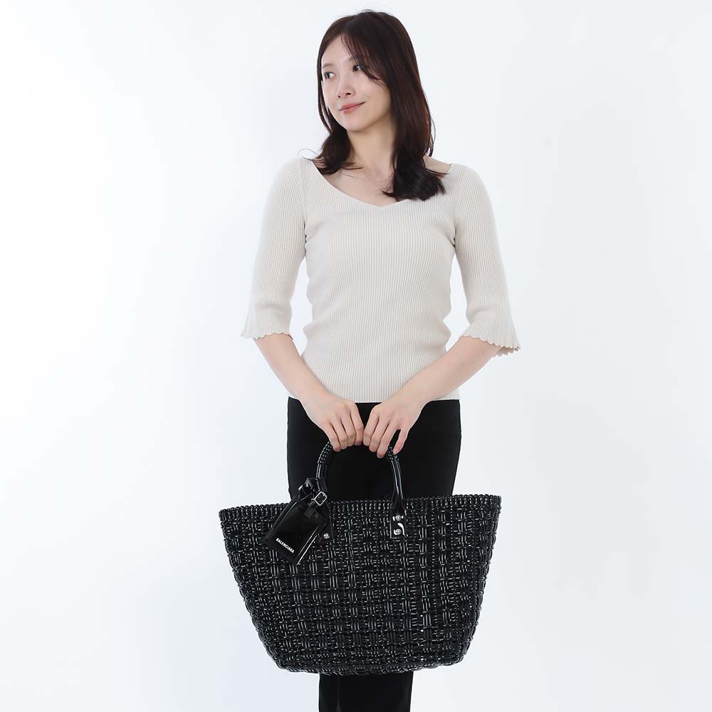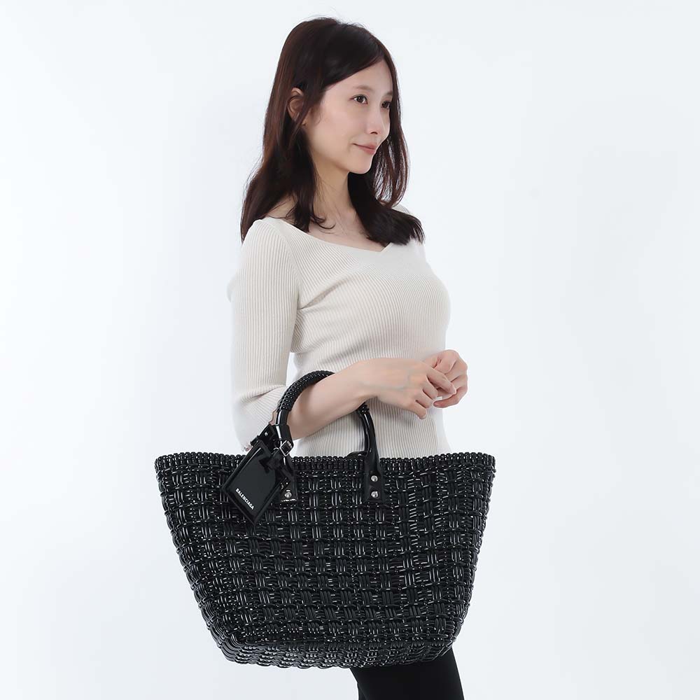 【商品名】 BALENCIAGA バレンシアガ 671346 2IE2Y 1000 ビストロ Bistro S ストラップ付き バスケット エナメルフェイクカーフスキン (新品) 【品番】 671346-2IE2Y-1000 【カラー】 ブラック 金具:シルバー 【素材】 ポリウレタン 【サイズ】 約:幅(上部)51.0cm(下部)32.0cm×高さ30.0cm×マチ×14.5cm 持ち手約:34.0cm ショルダーの長さ約:105.0cm~114.0cm(調節・取り外し可能) バッグの重さ約:1.2kg 【仕様】 開閉:オープン式 + ベルト式 (取り外し可能) 内側:ファスナーポケット×1 【原産国】 イタリア 【付属品】 ブランド保護袋、ショルダーストラップ、ラゲッジタグ ※その他付属品はございません。 ----------------------------------------------- BALENCIAGA (バレンシアガ)から、Bistro S ストラップ付きバスケット エナメルフェイクカーフスキンが入荷しました。 高度な縫製技術によるシンプルかつ芸術性の高いスタイルで艶のあるフェイクレザー製ショルダーバッグの入荷です。 カゴバッグ風の編み上げデザインに、ファスナーポケットを備えた収納。 ショルダーストラップは取り外し可能、持ち手にもセキュリティ面も安心のベルト付き。 ロゴ入りの取り外し可能なラゲッジ タグ付き。 自分へのご褒美や贈り物にも最適。