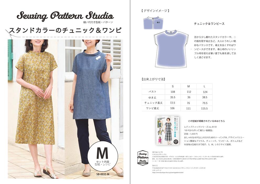 スタンドカラーのチュニック&ワンピ 型紙 S M Lサイズ【ブティック社/型紙/大人服/パターン/縫い代付き/ワンピース/チュニック/スタンドカラー/レディース/ソーイング/カジュアル/3サイズ/かんたん/】