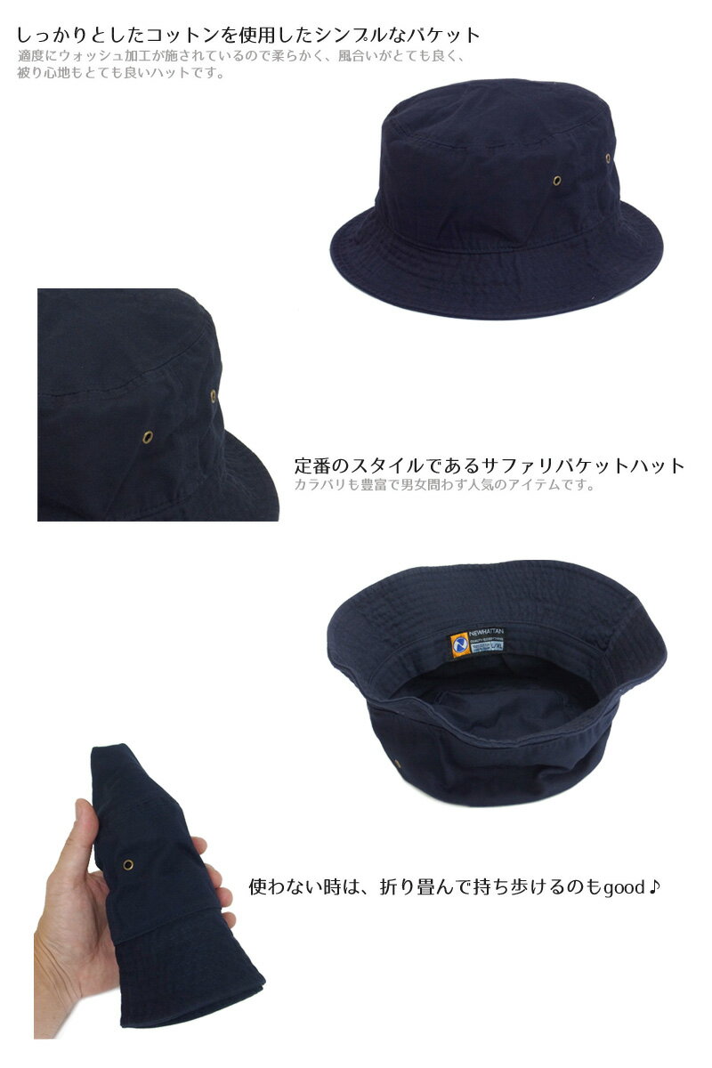 ☆しっかりとしたコットンを使用したシンプルなバケット適度にウォッシュ加工が施されているので柔らかく、風合いがとても良く、被り心地もとても良いHATです。定番のスタイルであるサファリバケットハットは幅広く男女問わず人気のアイテムです。カラバリも豊富で、バリュープライスも魅力的です♪気分に合わせて色を変えてみる事も楽しめます!。 ◆NEWHATTAN◆ NEWYORK発の伝統的なスタイルを現代に高いクオリティーとリーズナブルな価格で提案するNEWHATTAN サイズ :S/M(約58cm〜約59cm) サイズ :L/XL(約59cm〜約60cm) ※BLACKのみXL表記となります。 素材 :コットン