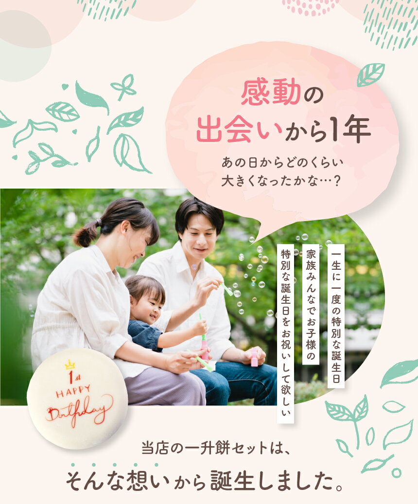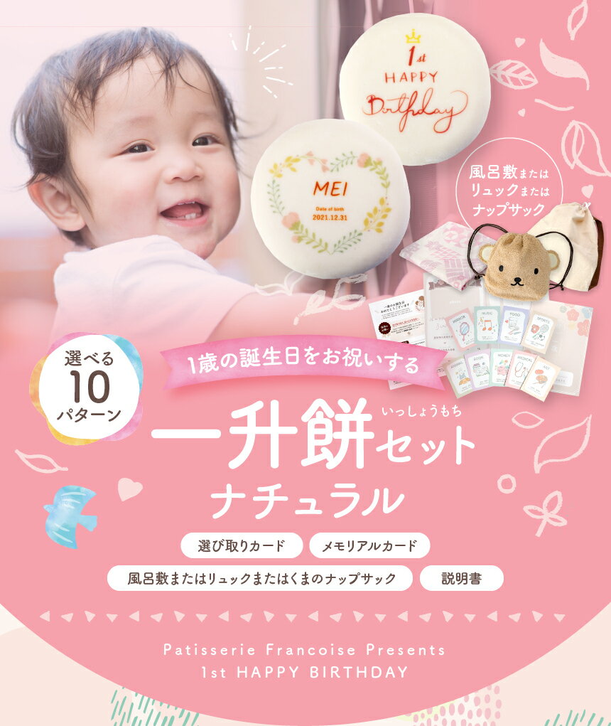 ご注意 ●熨斗(のし)の対応はお受けできません。ご了承ください。 ●保存方法のしおりをお付けしております。ギフトにも安心してご利用下さい。 ●メールやお電話でご連絡が取れない場合、キャンセル処理をさせていただく場合がございます。 写真について ●お写真は、注文後すぐにお送り下さい。お写真の確認メールを翌営業日までに返信致します。メールが届かない場合は、誠に恐れ入りますが、ご連絡頂ますようよろしくお願い申し上げます。 ご希望のお写真を下記のメールアドレスまでお送りください。 photo@furansowa.com メールでお写真をお送りいただく際に、下記内容もあわせてお知らせください。 1.ご注文日 2.ご注文者名 3.受注番号 ※写真はお顔の大きさが小さいと綺麗に印刷されない場合がございます。 ※お写真の確認が取れない場合、ご希望のお届け日にお届けできない場合がございます。予めご了承ください。 原材料 もち米(国産)/着色料(赤102号、赤106号、青1号、黄4号) 内容量 白餅2個(約1.8kg)、選び取りカード、メモリアルカード、風呂敷またはリュックまたはくまのナップサック、説明書 消費期限 到着日を含む3日 配送方法 冷蔵便でお届けします。 一升餅セット お祝い用!選べる名入れ&デザイン【1歳の誕生日にぴったり】 1歳の誕生日に「一生食べ物に困らないように」と願いを込める伝統行事「一升餅」。 当店の一升餅セットは、名入れ・形・デザインが選べる、思い出に残るお祝い専用セットです。 ◆ 選ばれる理由 1. 安心の国内製造 国産もち米100%使用。保存料不使用で、小さなお子様にも安心してご利用いただけます。 2. 豊富なデザインと形のバリエーション 丸型・ハート型が自由に選べます。多彩なデザインもご用意。 3. 無料名入れサービス お子様のお名前、生年月日、写真を丁寧に印字。特別な日を彩る、世界にひとつだけの記念餅として人気です。 4. 風呂敷または背負い袋付きでお祝い準備が簡単 背負う姿は記念撮影にぴったり。 5. 選び取りカードで楽しく演出 お子様の将来を占う「選び取り」カードもセットに含まれており、家族みんなで楽しめます。 6. 双子のお祝いにも対応 双子や兄弟姉妹用に、お餅2個それぞれに名入れが可能です。 セット内容 一升餅(約1.8kg) ※形:丸型・ハート型(選択可能) ※双子用は、2個とも名入れ対応可 お名前、生年月日、写真印字(無料) 風呂敷または背負いリュック 選び取りカード(9枚:くすみカラーのおしゃれな色合いはそのままに、見やすいデザインにリニューアル) メモリアルカード(記念写真、選び取りカード、身長・体重の記録、記念手形などを1冊のカードにまとめて保管できます) 説明書 おすすめのご利用シーン 1歳の誕生日祝い 記念撮影やイベント演出(スタジオ撮影にもおすすめ) ご家族・ご親族とのお祝い会 双子・兄弟姉妹の同時お祝い 出産祝い・ギフト・記念品に ご注文前にご確認ください 名入れ内容はご注文時に必ずご記入ください(双子の場合は2名分)。 お餅はお祝い後にカットしてから冷凍保存が可能です。保存方法の案内も同梱しています。 賞味期限:到着日を含め3日間(冷凍保存の場合、カット後約3ヶ月保存可能) 配送日時指定をご注文時に必ずご指定ください。 このような方におすすめです 「一升餅セット」「名入れ一升餅」「初誕生祝い」「背負い餅」「双子対応一升餅」「ハート型一升餅」「選び取りカード付き」「1歳誕生日 記念品」などをお探しの方にぴったりの商品です。 1歳のお祝いを思い出深くしたい方、双子や兄弟姉妹と一緒に祝いたいご家庭にも最適。国産の安心品質で、贈り物や出産祝いとしても大変喜ばれています。 1歳のお誕生日おめでとうございます。フランソワの一升餅で楽しい一日をお過ごし下さい。 地域で異なる一升餅の呼び方 一生餅 背負い餅 踏み餅 ふみもち 餅踏み いっしょうもち おすすめポイント お祝いセット 風呂敷 名前入り 選び取り 送料無料 記念日 一歳 誕生日 プレゼント 1歳のお祝い追加の風呂敷およびリュックはこちらから
