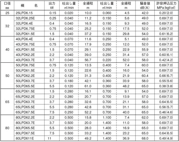 『荏原製作所・鋳鉄製ラインポンプ 65LPD63.7E 65mm/3.7kw/60HZ/200V』 ■用途 ・冷温水循環、各種機械セット用、一般給水 他 ■特長 ・直動形高効率ポンプにプレミアム効率モータを搭載しています。 ・小型で軽量しかもインライン形なので、配管の途中に取付ができ据付面積をとりません。 ・電動機に全閉外扇屋外電動機を採用(単相全機種及び三相0.15kWを除く) ・配管はそのままで、ポンプの分解・点検が可能です。 ・高温(100℃)、高圧(押込圧が最高0.69MPa)に使用できるので循環ポンプとして最適です。 ・軸封にメカニカルシールを採用しているので保守が容易です。 ■標準仕様 ■仕様 ■荏原 鋳鉄製ラインポンプ一覧 60HZ/100V 25LPD6.05S 25LPD6.08S 25LPD6.15S 25LPD6.25S 32LPD6.25S 32LPD6.4S 40LPD6.4S 60HZ/200V 25LPD6.15 32LPD6.25E 32LPD6.4E 32LPD6.75E 32LPD61.5E 40LPD6.4E 40LPD6.75E 40LPD61.5E 40LPD62.2E 40LPD63.7E 50LPD6.75E 50LPD61.5E 50LPD62.2E 50LPD63.7E 65LPD61.5E 65LPD62.2E 65LPD63.7E 80LPD62.2E 80LPD63.7E LP25A6.05S LP25A6.15S LP25A6.25S LP40A6.4S LP40B62.2-e LP40B63.7-e LP50A6.75-e 50HZ/100V 25LPD5.05S 25LPD5.08S 25LPD5.15S 25LPD5.25S 32LPD5.25S 32LPD5.4S 40LPD5.25S 40LPD5.4S 50LPD5.4S 50HZ/200V 25LPD5.15 32LPD5.25E 32LPD5.4E 32LPD5.75E 40LPD5.25E 40LPD5.4E 40LPD5.75E 40LPD51.5E 40LPD52.2E 50LPD5.4E 50LPD5.75E 50LPD51.5E 50LPD52.2E 50LPD53.7E 65LPD5.75E 65LPD51.5E 65LPD52.2E 65LPD53.7E 65LPD55.5E 80LPD51.5E 80LPD52.2E 80LPD53.7E 80LPD55.5E 80LPD57.5E 80LPD511E ※機名をクリックすると各ページへ遷移することができます。