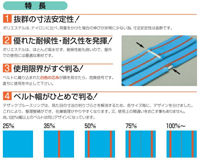 ※沖縄・離島への配送は追加送料を頂きます。 ご注文確認後に、こちらで変更させて頂きます。 送料表を確認しご了承の上ご注文をお願いします。 ・金属製品/鋼管・鋼材・線材・磨棒鋼・アルミ・ステンレス・銅・メッキ等 ・機械/機械部品:建築・工作・精密機械等 ・コンクリート製品/石材:ヒューム管・テトラポット・パネル・電柱等 ・木製品/紙製品:家具・ピアノ・彫刻・紙加工品等 ・プラスチック製品:ボート・浴槽 ・自動車製品:自動車本体・部品・原動機等 ・各種工事:建築・土木・造園・電気等 ・各種作業:引越・港湾荷役等 ・ポリエステルはナイロンに比べ、荷重をかけた場合の伸びが非常に少ない為、寸法安定は抜群です。 ・ほとんど吸水せず耐候性能も良いので、屋外での使用には最適な素材です。 ・ベルトに織り込まれた白色の芯糸が顔を見せたら危険信号です。 ・各サイズの寸法が一目でわかるように模様が入っています。 ★TESAC スリングベルト【両端アイタイプ】一覧はこちら↓ 幅 長さ 25mm 1.0m 1.5m 2.0m 2.5m 3.0m 3.5m 4.0m 4.5m 5.0m 5.5m 6.0m 6.5m 7.0m 7.5m 8.0m 8.5m 9.0m 9.5m 10.0m 35mm 1.0m 1.5m 2.0m 2.5m 3.0m 3.5m 4.0m 4.5m 5.0m 5.5m 6.0m 6.5m 7.0m 7.5m 8.0m 8.5m 9.0m 9.5m 10.0m 50mm 1.0m 1.5m 2.0m 2.5m 3.0m 3.5m 4.0m 4.5m 5.0m 5.5m 6.0m 6.5m 7.0m 7.5m 8.0m 8.5m 9.0m 9.5m 10.0m 75mm 1.0m 1.5m 2.0m 2.5m 3.0m 3.5m 4.0m 4.5m 5.0m 5.5m 6.0m 6.5m 7.0m 7.5m 8.0m 8.5m 9.0m 9.5m 10.0m 100mm 1.0m 1.5m 2.0m 2.5m 3.0m 3.5m 4.0m 4.5m 5.0m 5.5m 6.0m 6.5m 7.0m 7.5m 8.0m 8.5m 9.0m 9.5m 10.0m ★TESAC スリングベルト【エンドレスタイプ】はこちら(※クリックで商品一覧ページへ移動します)