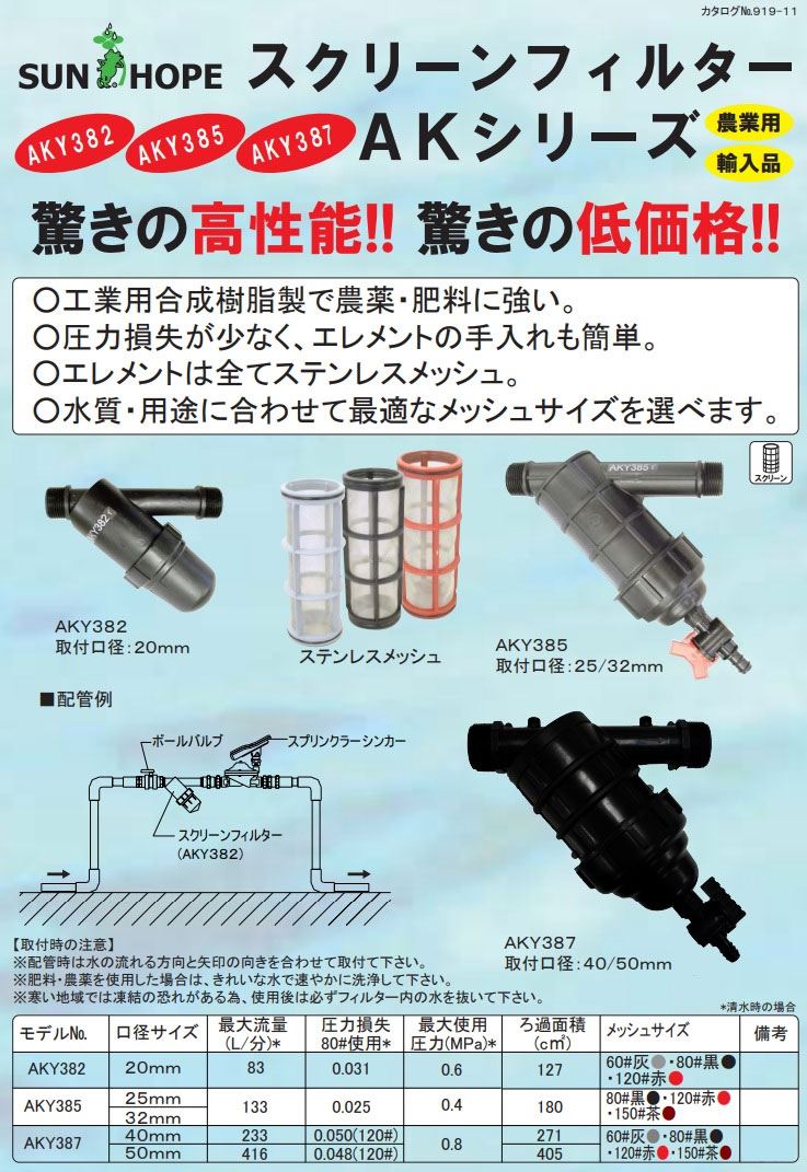 ・農業用水や産業用水の濾過などに。 ・工業用合成樹脂製で農薬・肥料に強い。 ・圧力損失が少なく、エレメントの手入れも簡単。 ・エレメントは全てステンレスメッシュ。 ・水質・用途に合わせて最適なメッシュサイズを選べます。 ・商品画像を参照してください。 ★取付口径の違う製品も取扱っております。↓ 20mmのページに移動します。 25mmのページに移動します。 32mmのページに移動します。 40mmのページに移動します。 50mmのページに移動します。