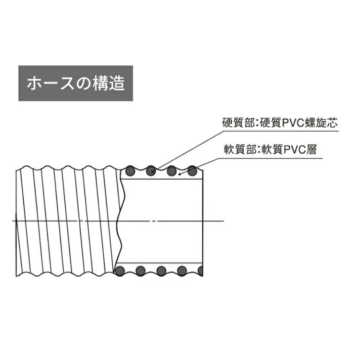 ・農業、工業、土木・建築などの吸水、排水用に。 ・粉流体の輸送用に。 ・外面が波型形状で曲げやすく、ハンドリングが容易です。 ・外圧に強く、保形性に優れています。 ・オール透明なので輸送物が外から確認できます。 ・口径規格:25mm ・長さ:5m/10m/20m/30m/40m/50m(選択項目からお選びください。) ・材質 硬質部:硬質PVC螺旋芯、軟質部:軟質PVC層 『カクイチ:サクションホースCL型一覧』 ホースタイプ 口径/長さ CLソフトタイプ 19mm5m~50m 25mm5m~50m 32mm5m~50m 38mm5m~50m 50mm5m~50m 65mm5m~50m 75mm5m~50m 100mm5m~50m ※各タイプのページへ移動できます。