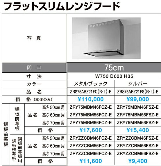【ZRS75ABZ21FC-E】クリナップ フラットスリムレンジフード シロッコファン メタルブラック ZRS75ABZ21FC(R/L)-E W75×D60×H35cm スッキリデザイン 省エネ性の高いLED照明付き メーカー直送便にてのお届け 沖縄・離島は別途送料