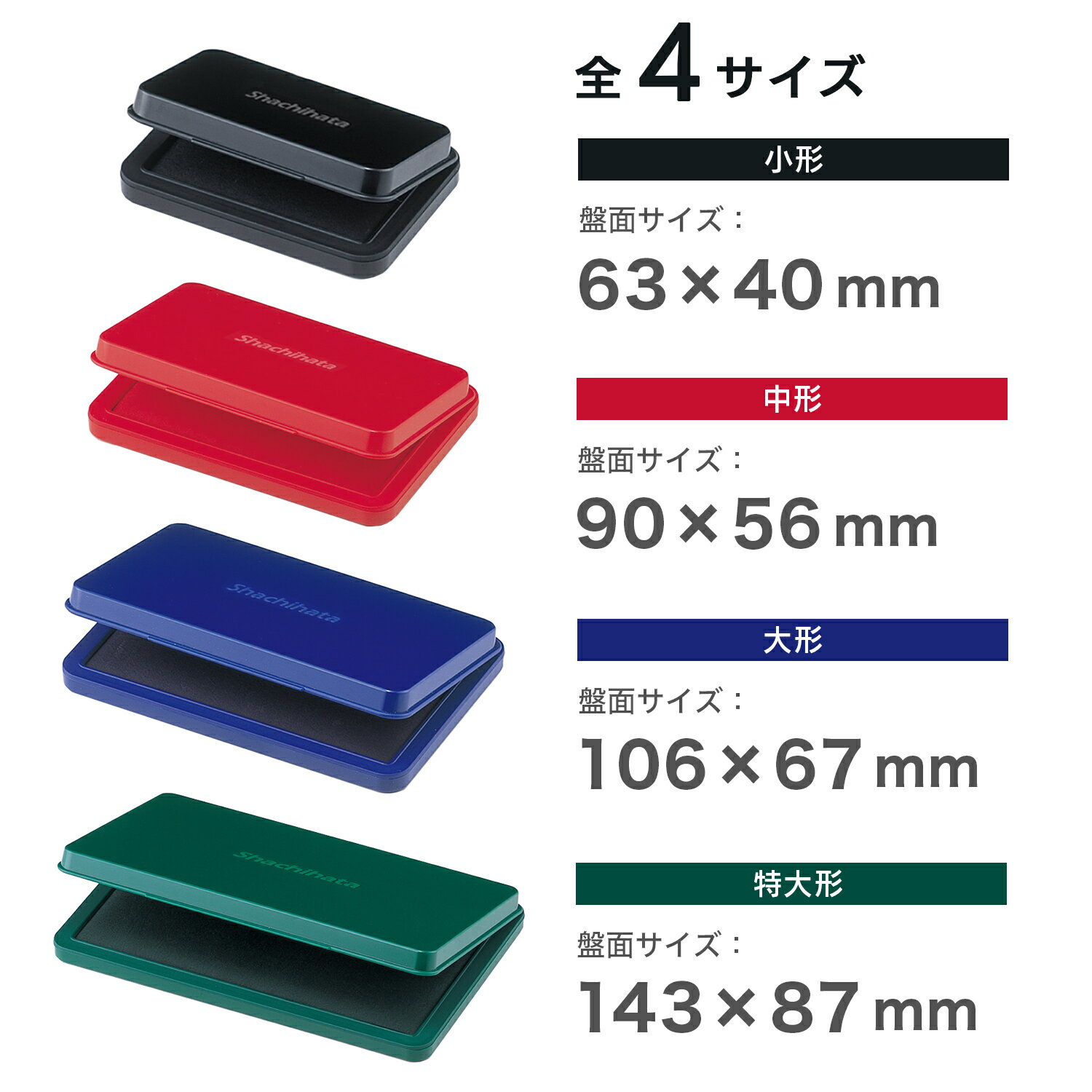 PPC用紙に約3秒で乾いて、キレイな印影 ・オフィスでの使いやすさアップ! ・補充時期までの期間も長く経済的 ▼盤面サイズ 小形:63.0×40.0mm 中形:90.0×56.0mm 大形:106.0×67.0mm 特大形:143.0×87.0mm ▼商品サイズ 小形:77.0×56.0×15.9mm 中形:104.0×72.0×15.9mm 大形:120.0×83.0×15.9mm 特大形:159.0×105.0×16.7mm ▼重量 小形:約36g 中形:約62g 大形:約85g 特大形:約143g ●乾きが早く、なつ印すぐ書類が重ねられる油性顔料インク採用 ●インキの補充スピードが、従来よりも約3倍速くなりました ●ボディは汚れにくく、拭き取りやすい光沢仕上げ ●フラットな形状なので、フタを開けた状態でも安定して使えます メーカー希望小売価格はメーカーサイトに基づいて掲載していますシヤチハタ スタンプ台 \専用補充インキはこちら/ クラフト用スタンプパッド \いろもようシリーズはこちら/