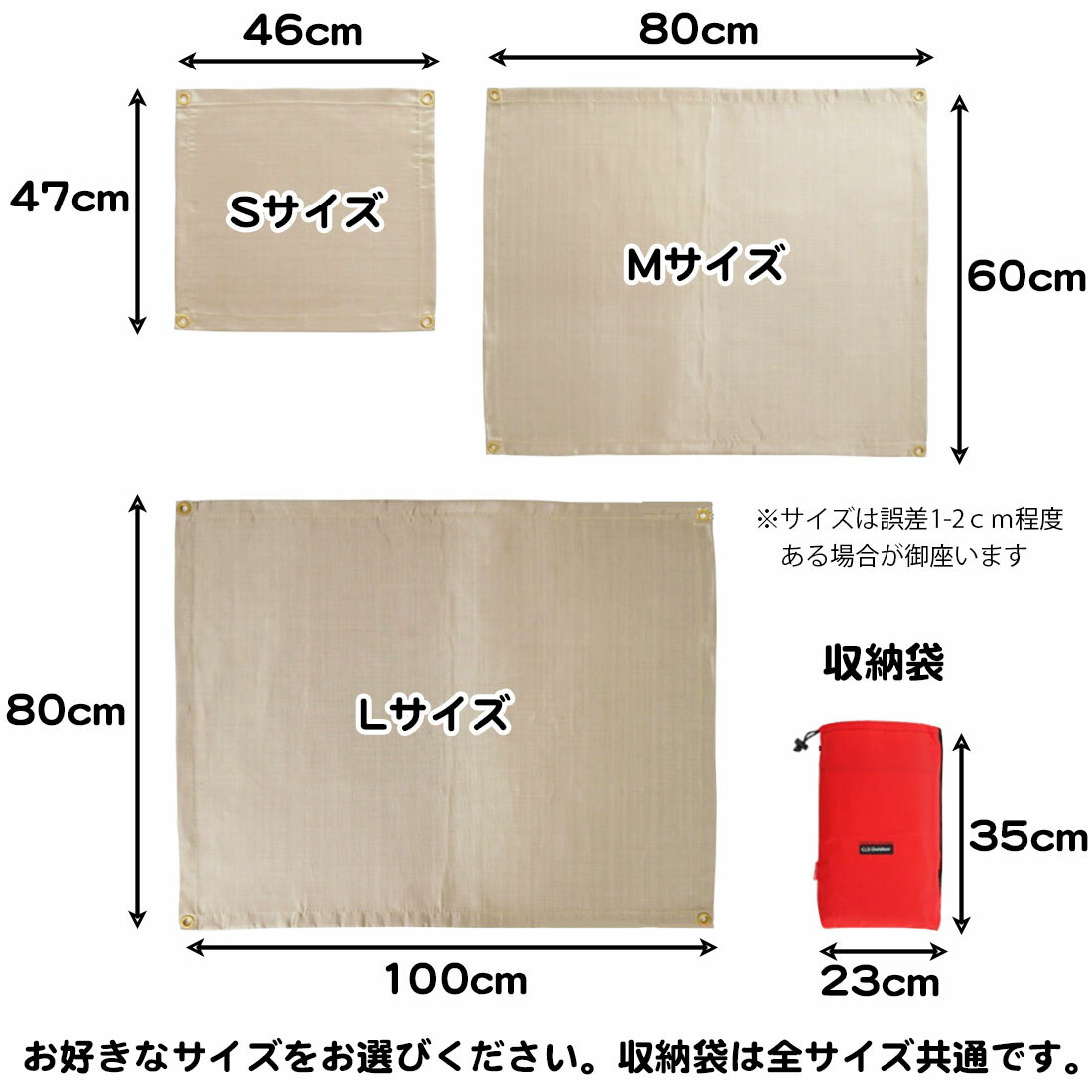 ・焚火などで下に引く防炎耐火マットです。ペグ打ちが出来るハトメ付きです。 ・S M Lの3サイズからお選びください。ソロキャンプからグループでのBBQまで対応します。 ・シートの素材は耐熱温度550℃の燃えないグラスファイバー製です。火の粉や炭などが落ちてもシートの下まで影響しないので地面の草木が燃えるのを防ぎます。 ・キャンプや自宅庭でのBBQなどに最適です。 ・収納も折り畳んで付属の収納袋に入れれば、コンパクトになり持ち運びも便利です。" ガラス繊維の素材で出来た防炎耐火マットです。 "