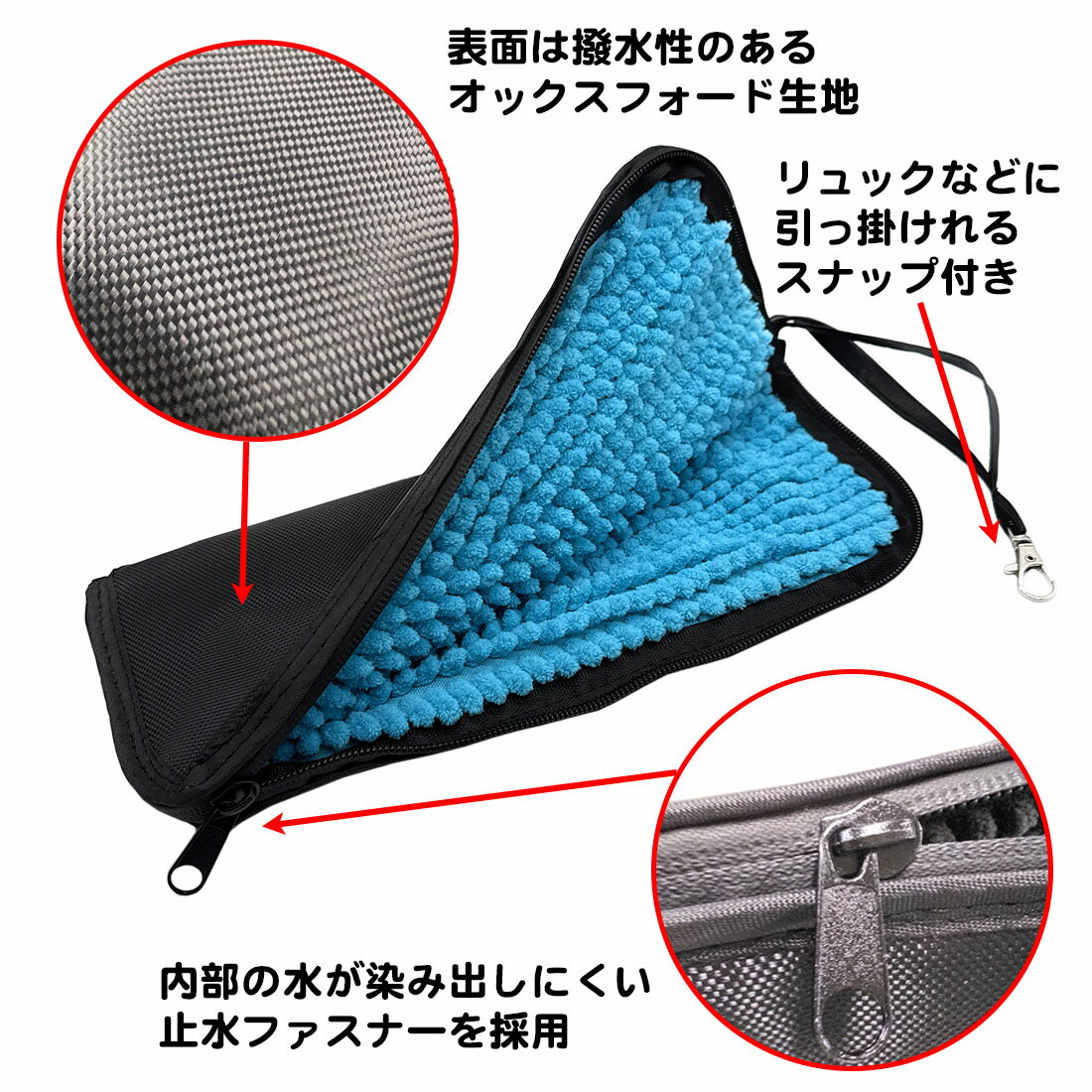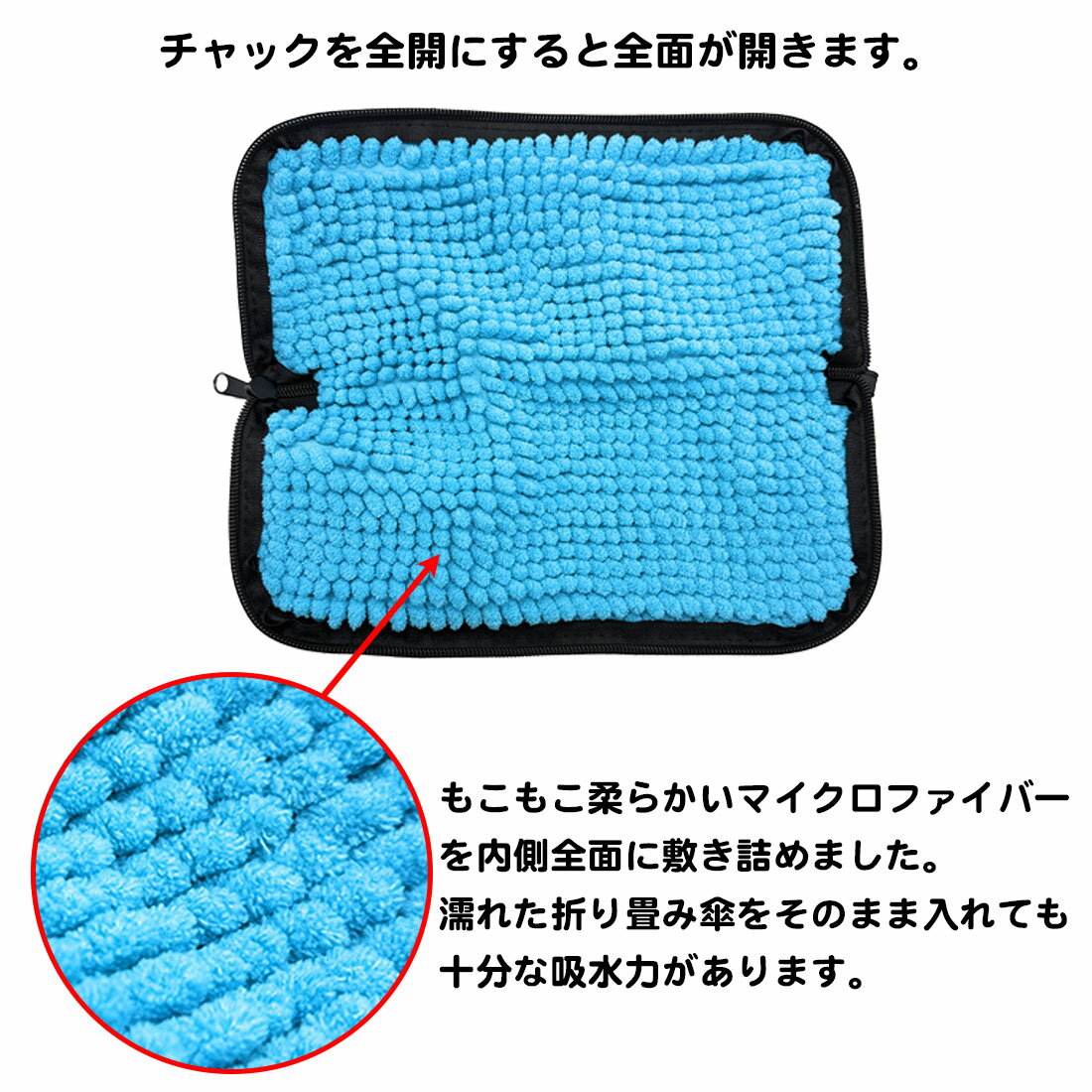 ・折り畳み傘の収納用カバーです。 ・中に大容量のもこもこマイクロファイバーを使用し、濡れたまま収納してもしっかり水分を吸収します。 ・濡れた傘を収納しても水が漏れ出さないように防水ファスナーを使用しています。 ・表面素材は撥水性のあるものを使用しています。 スナップ付きなので、シュックなどに引っ掛けておくと便利です。 ・サイズも豊富なので、お使いの傘のサイズに合わせてお選びください。" 吸水性抜群の折り畳み傘ケースです。 "