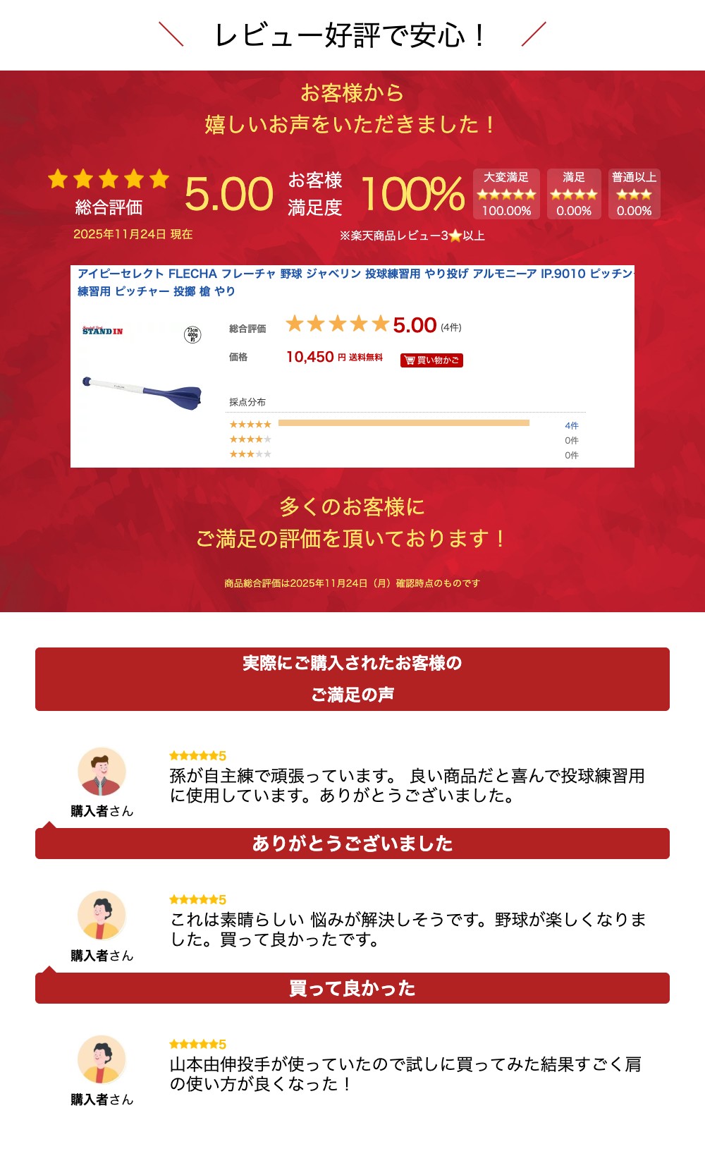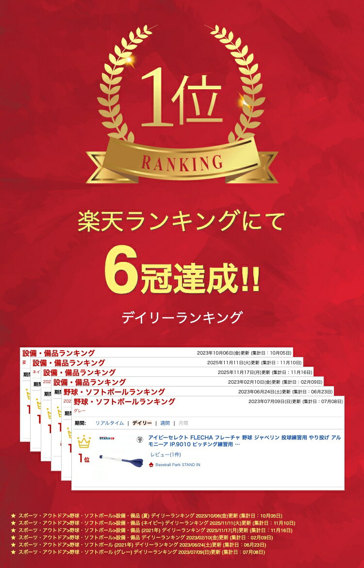 あの沢村賞投手Yも使用!投球練習用ジャベリン「FLECHA」登場! アイピーセレクトの投球練習用ジャベリン(やり投げの槍)、「FLECHA」です。 野球ボールを投げる感覚に近い設計がされており、全身を使って投げることで、肘や肩などに負担の少ない正しい投げ方を習得することができます。 この商品は、日本を代表する沢村賞投手Yの要望で開発されたもの。その選手は少し投げただけで腕がパンパン、肘に負担が来てしまう状況を改善するために、やり投げのような体全体を使って投げる練習を始めました。 一般的に良くないとされている「アーム投げ」に近い体の動きを取り入れることで、肘に負担がかかりにくいフォームを手に入れ、現在は日本を代表とするエースに成長しました。 FLECHAは発売以降大ヒットし、当店でも180本以上を販売。高校野球や少年野球の場でも採用するチームが増えるなど、大きな広がりをみせています。 あなたもFLECHAを使って、Y選手のようなダイナミックなフォームを手に入れましょう! 先端部のラインが横から縦になり、より強度が増した2023年改良モデルです。とはいえ土または人工芝のグラウンドなど、地面が柔らかい場所でのご使用にとどめ、コンクリートなど地面が固い場所での使用はお控えください。 素材 先端ボール:熱可塑性ポリウレタングリップ・羽:ポリプロピレン 商品スペック 長さ:約73cm 重さ:約400g カラー:ネイビー 備考 FLECHAの公式Youtubeチャンネルでは、正しい投げ方などを解説する動画がアップされています。 Youtubeで「Ip Select FLECHA」で検索してみて下さい。関連商品ニシ ゴリラゴールド グリップ力強化クロス ソフトボール 滑り止め T...SSK 野球 ゴムホームベース YH20 エスエスケイ...ゼット ZETT ジョイント(BM252)1,870円10,395円1,980円アイピーセレクト コマンド 2個入り アルモニーア ARMONIA I...ヴィクタス トレーニングバット ツーハンドトレーナー Two-Hand...29.0のみ ミズノ 野球 白スパイク ライトレボエリート グローバル...3,300円13,200円10,560円ミズノ 硬式 木製バット プロフェッショナル メイプル 84cm 89...ユニックス ホカクオイル専用スポンジタッチャーズ(BX7367) un...SSK 野球 テクニカルピッチ TP001 TECHNICAL PIT...10,230円275円33,000円成美堂スポーツ出版 野球 スコアブック(リング式)(9139)...【爪を守ろう!】アスリートネイル スポーツネイルファイル 爪ヤスリ 5...大谷翔平 ムーキー・ベッツ フレディ・フリーマン テオスカー・ヘルナン...1,760円644円32,000円