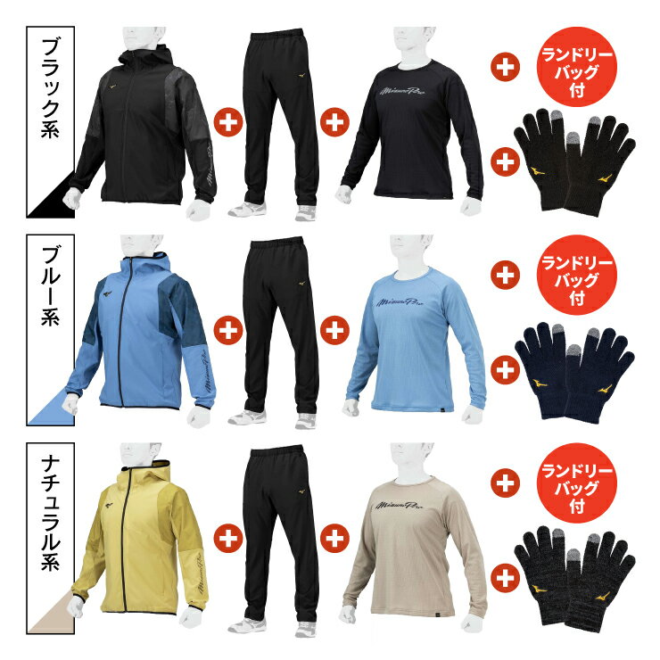 【2025福袋】ミズノプロ 野球 2025年 新春福袋 冬物ウェア+小物 5点セット テックシールドフーディー ロングパンツ 長袖Tシャツ ニット手袋 ランドリーバッグ メンズ 冬用 防寒 野球ウェア グランドコート スポーツウェア トレーニングウェア 暖かい mizuno pro