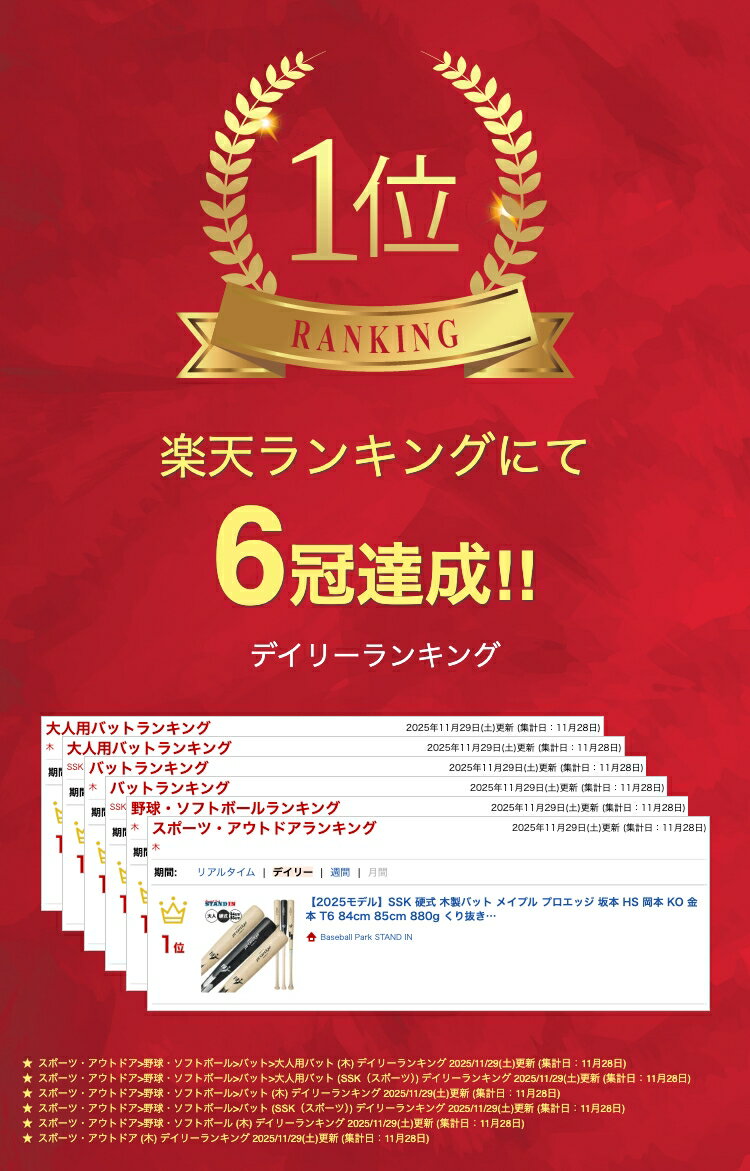 プロモデルを再現プロエッジ硬式木製バット! SSKのハイエンドシリーズ「プロエッジ」の硬式木製バット、2025年秋冬モデル! SSK契約プロ選手の使用バットを再現したシリーズ。 硬度・反発性が高く、衝撃に対しても強いメイプル材を採用。密度も高く目剥がれしにくい、耐久性の高い素材です。 先端くり抜き加工あり、日本製、BFJマーク入り。 大学野球、社会人野球プレーヤーの使用はもちろん、高校野球で900g以下の軽いバットを練習・試合で使用したい高校球児にもオススメです。 素材 木製(メイプル) 商品ラインナップ ■岡本モデル KO(ブラック×ナチュラル)■ 84cm-880g平均,85cm-880g平均 読売ジャイアンツ、岡本和真選手モデル。 グリップエンド形状はややフレア。テーパー部を絞り込み、トップバランスに。先端くり抜き加工あり。 ■坂本モデル HS(ナチュラル×Mブラウン)■ 84cm-880g平均,85cm-880g平均 読売ジャイアンツ、坂本勇人選手モデル。 グリップは細め。手首のかえしが容易な形状。先端くり抜き加工あり。 ■金本モデル T6(ナチュラル)■ 84cm-880g平均,85cm-880g平均 元広島東洋カープ・阪神タイガース、金本知憲氏モデル。 しっかりと握れるグリップ形状。ヘッドの重みを利用するパワーヒッター向け。先端くり抜き加工あり。 メーカー希望小売価格はメーカー商品タグに基づいて掲載しています。関連商品SSK 限定 硬式 木製バット メイプル プロエッジ 松本 GM 坂本...【2025モデル】SSK 硬式 木製バット スレンダー形状 メイプル ...【魚雷バット登場】2025モデル ゼット 硬式 木製バット エクセレン...14,850円14,080円14,520円SSK 限定 硬式 木製バット メイプル プロエッジ 坂本 HS 岡本...【2025モデル】アンダーアーマー 硬式 木製バット メイプル 柳田 ...【2025モデル】ウィルソンスタッフ 硬式 木製バット ビーチ 84c...14,025円16,500円14,080円ミズノプロ 硬式 木製バット ロイヤルエクストラ メイプル 1CJWH...【2024新基準対応】SSK 硬式 金属バット ビートフライト ST ...【2024新基準対応】SSK 硬式 金属バット スカイフライト ST ...16,720円14,254円14,254円【2025モデル】ウィルソンスタッフ 硬式 木製バット 超軽量 プロメ...ローリングス 硬式 木製バット ハードメイプル マックジャック 84c...【2025モデル】ウィルソンスタッフ 硬式 木製バット プロメープル ...18,480円12,320円18,480円