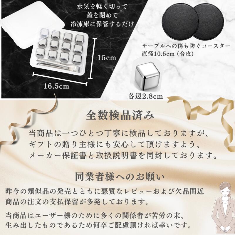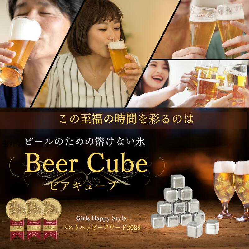 【ビアキューブ 12個入】 アイスキューブ 溶けない氷 ステンレス 氷 誕生日 父の日 プレゼント 男性 女性 贈り物 景品 退職 転職祝い 冷却効果に優れ、ビールの風味を損なうことなく、理想的な冷たさを保ちます。飲料に長時間入れるアイテムであるため、高品質素材を使用し、第三者機関による厳格な安全試験を通過しています。大切な方への贈り物としても最適です。 ビアキューブは各辺2.8cmの安全性を考慮したアイスキューブの中でも大きめサイズ。誤飲防止と安定性を重視し口にぶつからずグラスの底で静止しやすい仕様です。 12個入(2~3杯分)| コースター2枚| 蓋付き透明ケース|トング|説明書|180日間保証書|BOX16×18×高5cm 【ご利用方法】 ビールやアイスコーヒーなど味と香りを薄めずに最後の一滴まで冷たいまま飲み干したい飲料におすすめです。 外側がステンレスの溶けない氷であり、構造特性上、水の氷のようにキンキンに冷却できるアイスキューブは存在しません。アイスキューブは「保冷する」アイテムです。※冷却広告を謳う誇大広告にご注意ください。