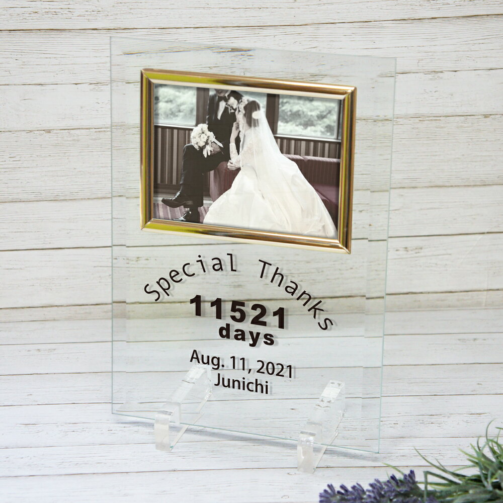 ギフト対 応 ガラス製フォトフレーム型の感謝状です。挙式が終わってもご自宅でずっと飾ってほしい!そんなご要望にお応えして記念に残るフォトフレーム感謝状を作りました。お手入れにはメガネクロスのような柔らかい布で拭いてください。 フレームに印字する内容「1.タイトル 2.メッセージ 3.日付など」をご用意下さい。 1.Special Thanks 2.いままでありがとう 3.2021.5.20 Yuika ●簡易プリント写真サービスについて ギフト用に写真を予め入れて送りたい場合はメールにて写真画像を送って下さい。簡易プリントで印刷し、セッティングします。(*写真プリントではありませんカラープリントになります)。 写真はサービス判サイズを入れる事が出来ます。写真は縦型(L判サイズ8.9×12.7cm)を入れてください。 【お申し込みは簡単!】 お客様からのご注文後、自動返信メール以外に店舗確認メールが送信されます。1日〜2日後に確認用のレイアウト画像をメールにてご案内します。お客様に確認をしていただき問題がなければ製作に進みます。その後5日〜6日ほどで完成です。 【製作手順】 (1)選択肢でデザインを選んでください。 (2)お名前・日付などのメッセージは、買い物カゴ中の備考欄にご記入下さい。 (3)約2日後、イメージ画像が完成します。メール添付しますので確認をお願いします。 (4)問題がなければ製作開始。約10日ほどで完成 (5)商品発送 お客様から御注文後、自動返信メールの後に「ご注文ありがとうございました」件名の確認メールが届きます。上記の「お名前や記念日」を記入忘れの場合は届いたメールにご記入いただきご返信下さい。 土日祝日は確認メールが届かないため御注文後、こちらのメールに上記内容を記載いただいて事前に送っていただいても構いません。(必ずお名前とお電話番号はお知らせ下さい) ■製作期間は10日間です ■フレームサイズ:24×17.7cmアクリルスタンド付き(写真L判用) ■箱入りラッピング無料 ■お手入れにはメガネクロスのような柔らかい布で拭いてください。 ■必ずイメージレイアウトをメール添付いたしますのでご確認下さい。