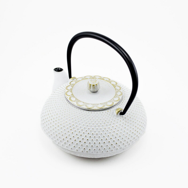 ◆改元にあたり祈年の令和急須アラレ鍋敷きセットを令和元年5月1日より発売いたしました。 ◆伝統のアラレ模様に梅の花をモチーフとした蓋と鍋敷きを組み合わせ、白梅色におめでたい金色を配色し気品と華やかさをプラスしております。梅の花薫る優雅なひとときをお過ごしいただければと存じます。 ◆昔ながらの南部鉄器は、けっして内側の鉄に触らないなど大事にするコツがありますが、こちらは内側ホーロー仕上げ。直接お洗いいただける、使いやすさを採用しました。鉄分補給むきではないですが、お茶本来の香味がじっくり楽しめます。 ◆鉄は厳選した上質な鉄を使い、岩手の工房で丁寧に焼きを入れて美しい質感を作りあげています。贈りものにも好適です。 ◆お手入れの時間を半分に、美しい本格鉄器のエッセンスを毎日に。 ※鍋敷きの裏面の刻印が「及富」という文字から家紋に変わります。 急須仕様表 材質 鉄鋳物(内部ホーロー加工) 意匠 白梅色 容量 0.45L 径 本体部 Ø 約14.0cm(注ぎ口込 約15.7cm)本体開口部 Ø 約7.0cm、フタØ 約7.5cm 高さ 本体部 約6.5cm把手部 約8.0cm(全体約14.0cm) 重さ 約1063g 持ち手の仕様 稼働可・水平位置まで倒せます 加熱 直火…不可/IHヒーター・コンロ…不可通常の急須のようにお愉しみください 制作 南部宝生堂 及富(岩手県奥州市水沢)創業嘉永元年1848年 鍋敷き仕様表 材質 鉄鋳物 重さ 約325g 直径 約16.0cm 制作 南部宝生堂 及富(岩手県奥州市水沢)創業嘉永元年1848年 *鉄を1つずつ型に流しこむ鋳物のため重さに多少の個体差がございます。仕上がりの風合いに差はございません。 *お手入れは、洗ったあとよく乾かして収納してください。 【南部鉄器カラー急須 使用上の注意点】 ※強くこすったり洗剤で洗うと色落ちの原因になるため、軽いお湯洗いがオススメです。拭きとりは乾いた布巾で押さえるように。 ※内部ホーローの品は、直火・IH不可です。また、鉄分の溶出はありません。 ※万一ホーローにいたみが出てきた場合は使用をお控えください。 ※ご購入前にご確認ください!※配送時の注意点 商品到着後は、必ず中身の確認をお願いいたします。 配送先後からの転送や持ち出し後の商品不良は保証対象外です。 ★Starry JAPAN 伝統工芸品はこちら