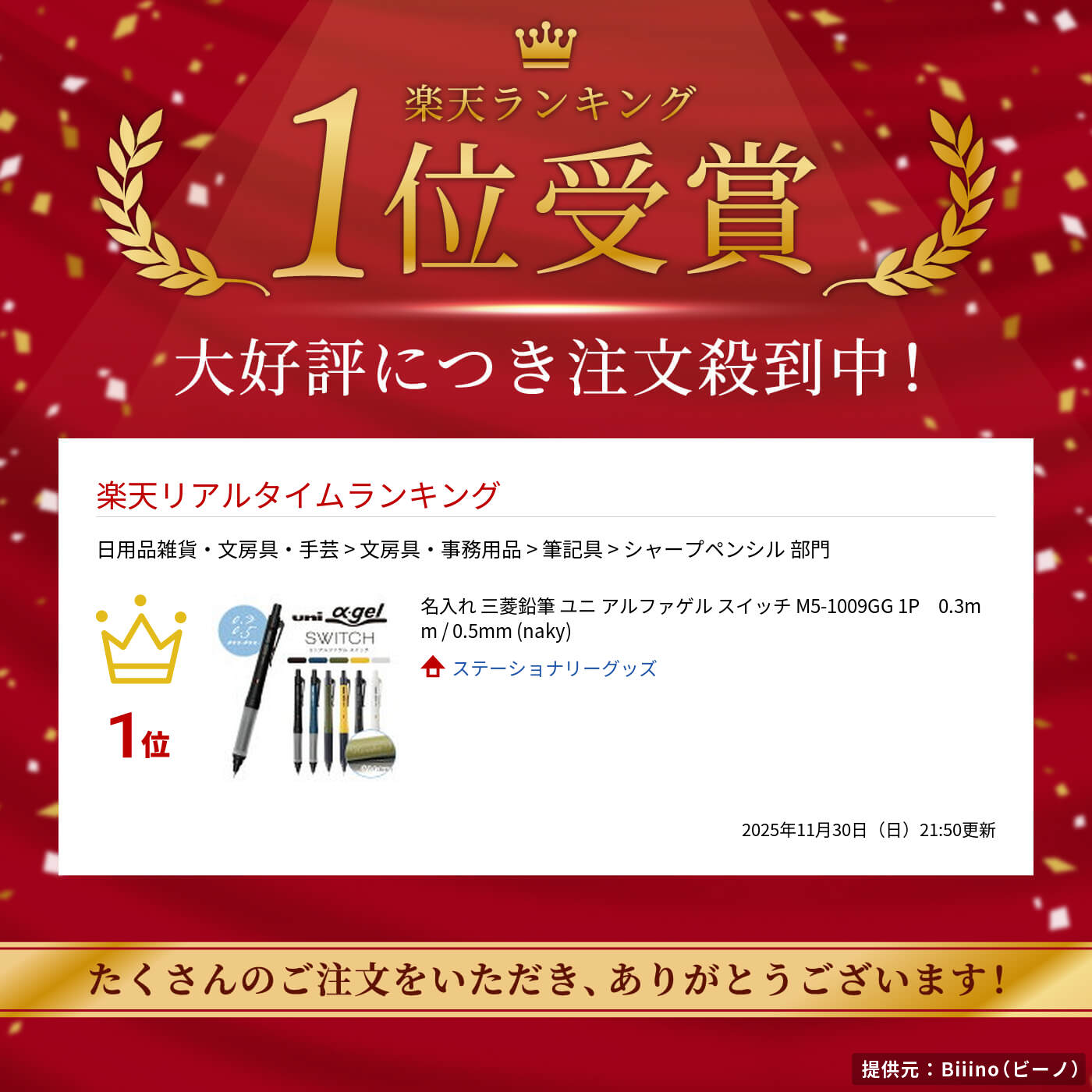 名入れ 三菱鉛筆 ユニ アルファゲル スイッチ M5-1009GG 1P 0.5mm クルトガモードとホールドモードを切り替え、使用シーンに合わせて使える クリップ部を回すことで、“クルトガモード”と“ホールドモード”に切り替えられることができます。 “クルトガモード”:書くたびに芯が少しずつ回転することにより、芯の先がいつもトガっているので、書いた文字が太ることがなく、キレイに書くことができます。キレイなノートを作りたいという場合に最適です。 “ホールドモード”:文字の太さの違いや濃淡を気にせずに、ノート全面に早くたくさん書きたい場合に、安定した筆記感で書くことができます。暗記等の勉強に最適です。 やわらかくて弾力性のあるアルファゲルをグリップ部に採用しています。 抜群のフィット感と癒されるにぎり心地を実現しています。 商品スペック 【品番】 ◆0.5mm ネイビー / M51009GG1P.9 ブラック / M51009GG1P.24 ダークオリーブ / M51009GG1P.18 イエロー / M51009GG1P.2 ◆0.3mm ブラック / M31009GG1P.24 グレー / M31009GG1P.23 【芯径】 0.3mm / 0.5mm ※こちらの商品は楽天が別途定めるガイドライン等にて指定するカード対象取引に該当するため、分割払い、リボルビング払いおよびボーナス一括払いの支払区分を利用することができません。予めご了承ください名入れ可能商品一覧⇒----------------- 名入れに関しての注意事項※文字間隔やレイアウトは当店の判断で微調整させていただくことがあります。・筆記体のお名前の場合、頭文字は大文字、それ以外は小文字に変更させていただきます。・人名以外や当店で判断できかねる場合はご入稿通りで名入れいたします。 後々のトラブル防止の為、全部大文字等、大文字小文字は入稿通りで名入れをご希望の場合は、入稿文字と一緒に【全て大文字で】【入稿通りで】等、気になる点は必ず別途ご指示ください。左利きのお客様もご指示いただければ対応いたします。 また、文字化けする可能性のあるお名前はあらかじめメッセージ欄に一言入れていただけると幸いです。 ※名入れ内容に不備等がある場合は、当店から内容確認のメールやお電話をさせていただく場合がございます。※当店で受注確認後、すぐに作業にとりかかりますので、ご注文後の名入れ内容の変更は間に合わない場合がございます。よく確認の上ご注文お願いいたします。複数ご注文くださる場合は、ご希望商品をそれぞれ買い物かごに入れて書体等を選択し、名前をご入力ください。そして決済してしまわずに、また戻って次の商品を選択し、名入れのご指示を繰り返していただければ一度にご注文いただけます。又は、ご希望商品と名入れ内容だけを選択し買い物かごに入れて頂いた後、備考欄にまとめて名前をご記入いただいても問題ございません。※カラーなどが異なる場合は必ず下記参考例のようにご記入ください。 ・ブルーグレー 筆記体 Y.hanako・ペールオレンジ 日本語(明朝体) 山田太郎 関連商品はこちら名入れ無料 パイロット ドクターグリッ...1,100円名入れ 三菱鉛筆 ピュアモルト 多機能ペ...1,100円名入れ ボールペン パイロット アクロ10...1,100円名入れ 三菱鉛筆 ジェットストリーム エ...2,475円