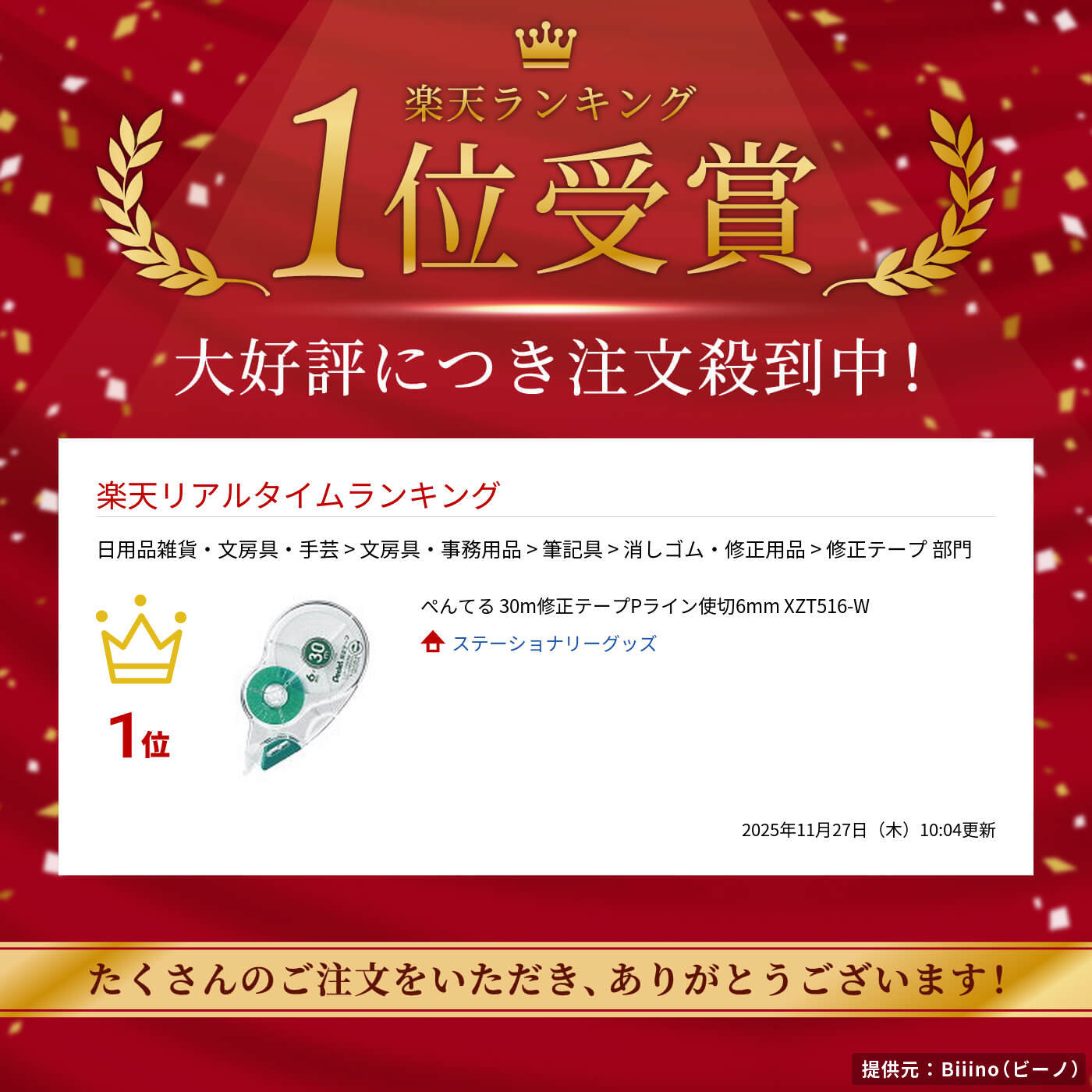 ぺんてる 30m修正テープPライン使切6mm XZT516-W商品スペック●テープ寸法:幅6.0mm×長30m●外寸:全長83×横48×厚19mm●材質:再生素材使用●タテ引き●スライドカバー付※仕様変更で商品画像と異なる場合があります。ご了承ください。