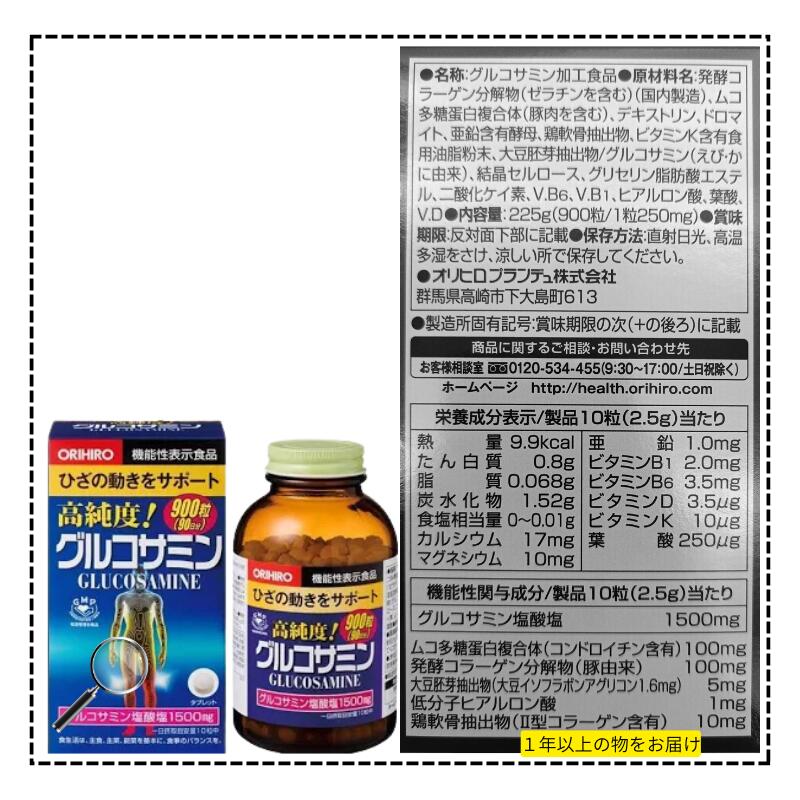 商品情報内容量1個当たり 225g(900粒/1粒250mg)原材料発酵コラーゲン分解物(ゼラチンを含む)、ムコ多糖蛋白複合体(豚肉を含む)、デキストリン、ドロマイト、亜鉛含有酵母、鶏軟骨抽出物、ビタミンK含有食用油脂粉末、大豆胚芽抽出物/グルコサミン(えび・かに由来)、結晶セルロース、グリセリン脂肪酸エステル、二酸化ケイ素、V.B6、V.B1、ヒアルロン酸、葉酸、V.D主要成分 製品10粒(2.5g)中機能性関与成分:グルコサミン塩酸塩 1500mgムコ多糖蛋白複合体(コンドロイチン含有)100mg発酵コラーゲン分解物(豚由来)100mg大豆胚芽抽出物(大豆イソフラボンアグリコン1.6mg)5mg低分子ヒアルロン酸1mg鶏軟骨抽出物(2型コラーゲン含有)10mgカルシウム17mgマグネシウム10mg亜鉛1.0mgビタミンB1 2.0mgビタミンB6 3.5mgビタミンD 3.5μgビタミンK 10μg葉酸250μg届出表示本品にはグルコサミン塩酸塩が含まれます。グルコサミン塩酸塩は膝の動き(曲げ伸ばし)をサポートし、膝の違和感を軽減することが報告されています。本品は膝関節に関する生活の質を高めたい方に適した食品です。お召し上がり方一日10粒を目安に、水またはお湯と共にお召し上がりください。アレルギー情報えび、かに、ゼラチン、豚肉、大豆注意事項原材料をご参照の上、甲殻類アレルギーの方や、その他食物アレルギーのある方はご利用を控えてください。抗血栓薬をご使用の場合は、医師、薬剤師に相談してください。賞味期限残2年以上の物を発送いたします。オリヒロ 高純度 グルコサミン 塩酸塩 1500mg 機能性表示食品 粒徳用 900粒 90日分 関節ケア サプリメント 曲げ伸ばし 違和感軽減 健康維持に 中高年の膝の悩みに!機能性表示食品グルコサミンでスムーズな毎日へ!900粒×6個の大容量 いつまでも活動的な毎日を送りたいあなたへ。オリヒロの「高純度 グルコサミン 粒徳用 900粒」は、膝の動きをサポートし、違和感を軽減する機能性表示食品です。一日目安量10粒にグルコサミン塩酸塩を1500mg配合。さらに、ムコ多糖蛋白複合体(コンドロイチン含有)、発酵コラーゲン、低分子ヒアルロン酸、2型コラーゲンなど、充実のサポート成分をバランス良く配合しています。中高年の健康維持、階段の上り下りや散歩が辛いと感じる方、膝関節の柔軟性を保ちたい方におすすめです。大容量900粒入りで約90日分と経済的。毎日の習慣で、軽やかな膝を取り戻し、活動的な生活をサポートします。お得な徳用サイズで、ご家族皆様の関節ケア、健康維持にお役立てください。サプリメント選びに迷ったら、信頼のオリヒログルコサミンをお試しください。 5