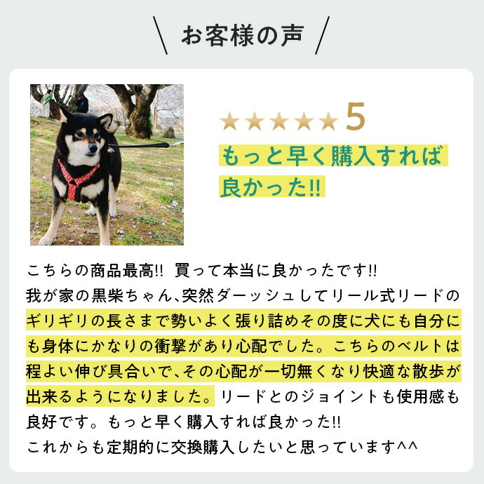 ソフトストップベルトの説明 ソフトストップベルトは、フレキシリード本体とは別に、その本体の先につけるアクセサリーで、ゴムのように伸び縮みして、衝撃を和らげる働きをするものです。急にブレーキを利かせても、犬への衝撃は軽減され、優しく安全に愛犬をコントロールすることができます。また、ベルト部分に反射機能が付いており、車のライトなどに照らされると反射し存在を知らせる役割もございます。愛犬の体重に合わせて、2種類のサイズ展開がございます。 詳細のスペック ・S/Mサイズ:愛犬の体重は25kg未満まで対応、ベルトの長さは銀色のフック部分を合わせて約34cm、太さは12mm、重量は34g ・Lサイズ:愛犬の体重は50kg未満まで対応、長さは銀色のフック部分を合わせて約35cm、太さは20mm、重量は73g つなぎ方 フレキシリード本体の先端のナスカンにこちらの商品の丸い輪を繋げていただき、リードを延長するような形で、この商品のナスカンを愛犬の首輪などにおつなぎ下さい。 伸縮リードの説明 伸縮リードは、持ち手のスイッチを操作することで、紐(ひも)の長さを自由自在に調節できるリードです。運動不足解消のために広場で「愛犬を思いっきり走らせてあげたい」という飼い主様の想いと、たまには「自由に好きなように歩き回りたい」という愛犬の想いを叶えてくれます。首輪やハーネス、犬用服を着用していてもお使いいただけます。 普通の固定リードとしても使えます 普段のお散歩では、スイッチにロックをかけることで、紐を一定の長さに固定させられるのでいつもの固定リードとしてもお使いいただけます。歩道の幅や人通りの多さに応じて、自由自在に愛犬との距離を調節し(短い〜長い)、安全にお散歩をお楽しみ頂けます。そして、広場や公園があった時に、固定を解いて自由に走り回らせることができるので、自由と安全性のいいとこどりができ、普段のお散歩が更に楽しくなります。 犬がたくさん歩けます 愛犬の健康維持には毎日15kmのお散歩が必要とされています。犬伸縮リードならば、飼い主が同じ距離を動き回らなくても、犬は行ったり来たりで、たくさん歩くことができます。もちろんジョギングのおともにもぴったりです。 散歩だけでなく、呼び戻しの訓練にも リードの長さの調節がスイッチ一つで簡単に行えるので、徐々に距離を長く伸ばして、呼び戻しの訓練に使うこともできます。最初は短く、少しずつ伸ばして行き、最終的にはフルに伸ばして、など、目標を決めやすいのも長所の一つです。 フレキシの紹介 フレキシとは、世界で90ヵ国以上の愛犬家に愛用されているドイツ製の伸縮リードです。世界で初めて(世界初)伸縮リードを発明したメーカーで、特許を取得しております。 フレキシは長くヴァリオ vario シリーズが展開されましたが、2018年に廃盤となりました。 現在は下記の豊富な種類のラインナップで展開しております。 ニューコンフォート:握りやすいソフトグリップでお散歩の快適さを追求した定番モデル ニューネオン:ネオンカラーで暗い夜道や早朝のお散歩の安心・安全をより重視 ニュークラシック:フレキシの性能はそのままにお買い求めしやすい価格帯のシンプルなシリーズ ジャイアント:体重の大きな犬のために特別に開発されたリードで、堅牢で耐久性に優れています。 スタイル:上品なカラーリングとマットな質感が特徴 エクストリーム:テープリードの耐久性を極限まで高め、ソフトストップベルトを標準装備 レザー:最高級の山羊皮から職人技が感じられる一品 グラム:100個以上のスワロフスキークリスタルを散りばめたゴージャスなリード 弊社シュトルヒでは、ドイツでフレキシが展開している全種類・全カラー・全サイズをどれでもお取り扱いしております。あなたの愛犬にぴったりな伸縮リードをお求めください。送料無料でお届けいたします。 自由に動けて、愛犬が大喜び 犬にとって散歩は最も欠かせないものの一つです。一日中ずっと家にいる犬は運動不足でストレスや肥満などの原因になります。 人が外に出て涼しい風を浴びたいと感じるように、犬も外で自由に遊びたいと感じているでしょう。 フレキシでは、犬が自由に遊べることができるように、コントロールと安定性を兼ね備えた伸縮リードの開発、改良を行っております。 巻き取りがスムーズで、安全を確保 モノづくりの国ドイツの工房で熟練職人たちが、手作業で製作しています。 特にこだわっているのが、巻き取りのスムーズさ。愛犬が自由に色んな方向に動き回っても、コードがスーッと滑らかに伸縮するので、まるでリードをしないで、自由に走り回っている感覚でワンちゃんも楽しく走り回れます。また、愛犬の足取りに合わせて紐が伸び縮みして犬本来の自由な動きを可能にしつつ、急に自転車が飛び出して来たり、ドッグランで他のわんちゃんと喧嘩しそうになったときなどは、ブレーキで飛び出しを防ぎ、ドッグオーナーの思い通りにいつでも