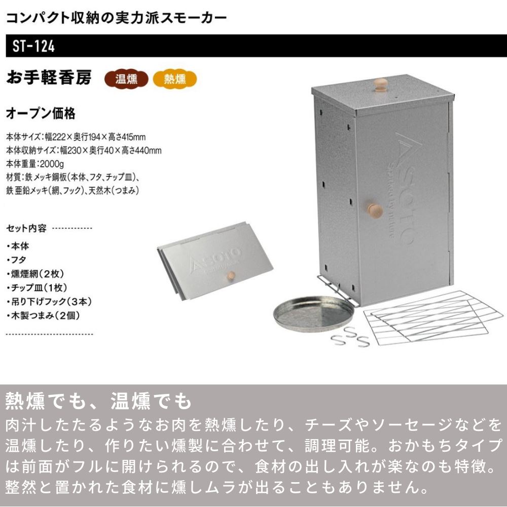 当社を装った偽サイトにご注意ください>> 【運送便について】基本的に ヤマト運輸 か 佐川急便 での配送となります。 ▼すぐ使えるクーポンをGET!▼ 規格 セット内容:本体、フタ、燻煙網(2枚)、チップ皿(1枚)、吊り下げフック(3本)、木製つまみ(2個)サイズ:幅222×奥行194×高さ415m/m(使用時)、幅230×奥行40×高さ440m/m(収納時)重量:2.0kg材質:本体・フタ・チップ皿=スチール(メッキ鋼鈑)、網・フック=スチール(亜鉛メッキ)、つまみ=天然木使いやすく、洗いやすい構造本体正面がフルオープンするスモーカー大きな食材も自由にレイアウト可能折り畳んで収納でき持ち運びも簡単 商品説明 熱燻でも、温燻でも肉汁したたるようなお肉を熱燻したり、チーズやソーセージなどを温燻したり、作りたい燻製に合わせて、調理可能。おかもちタイプは前面がフルに開けられるので、食材の出し入れが楽なのも特徴。整然と置かれた食材に燻しムラが出ることもありません。 生産国 日本 燻製グッズ SOTO ST-124 お手軽香房SOTO スモークポット coro ST-126SOTO スモークウッド SOTO スモークウッド ST-1557 ウイスキーオークSOTO スモークチップス SOTO スモークチップス ST-1317 ウイスキーオーク 他の選択肢も見てみる -kinds- アウトドア調理用品 -- 関連するカテゴリ -- レジャー調理用品 -- 関連するカテゴリ -- lsrsum_02_04,