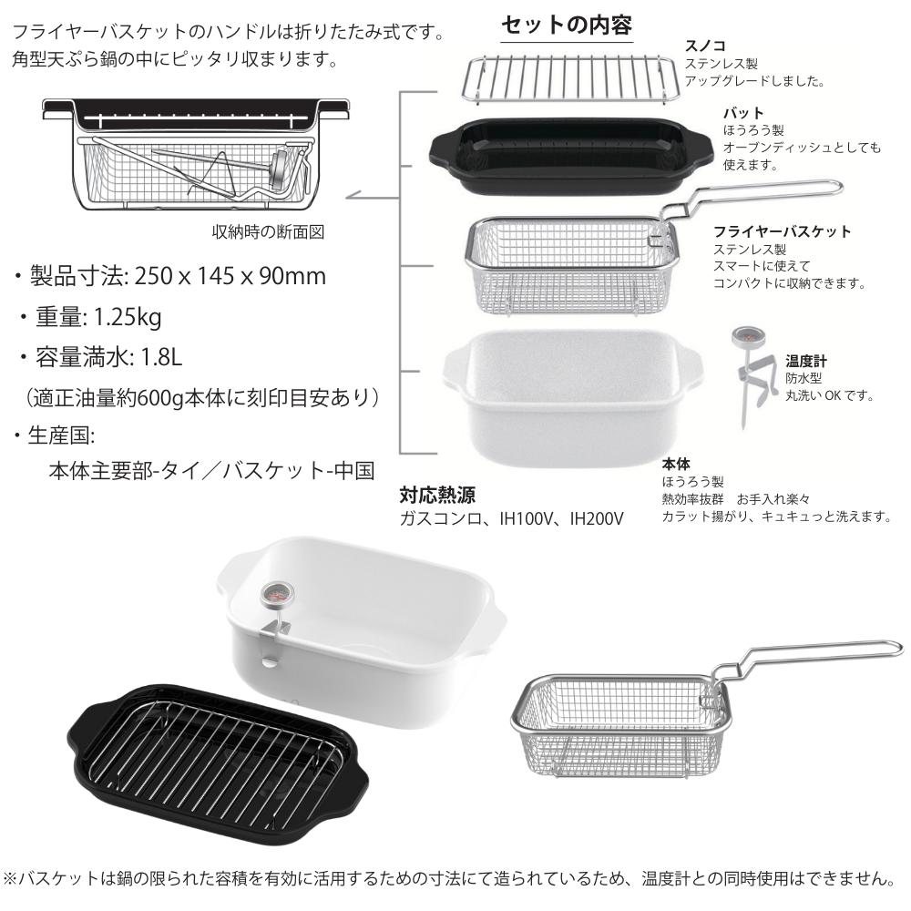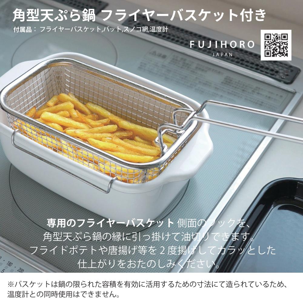 2025新商品 IH対応 富士ホーロー 角型 天ぷら鍋 ザル付き2点set 純正 | 琺瑯 揚げ鍋 角型天ぷら鍋 ホーロー 角型 スクエア 揚げ物 温度計付 鍋 コンパクト 揚げ物鍋 天ぷら 角 ホーロー鍋 四角 ほうろう バット 揚げざる 油切り ザル フライバスケット フライヤー 揚げかご