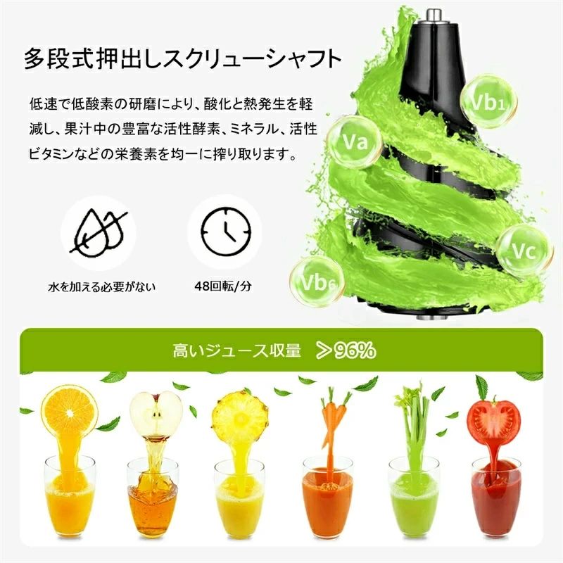 商品情報 付属品 1.ジュースカップ1000ml 2.搾りかすカップ700ml 3.プッシュロッド 4.クリーニングブラシ 注意事項 1.果汁の量とテクスチャーは、選んだ果物のさと種類によって決まります。 2.柔らかい食材や水分の少ない食材(例:マンゴー、いちご、バナナ、キウイ)は、硬い食材や繊維の多い食材(例:りんご、梨、人参、セロリ)と一緒に入れてください。 3.サトウカエシュ(甘蔗)のように硬くて繊維が多い食材は、この製品には適していません。 4.よくレモン汁のような酸性食品は作らないでください。 5.本製品をご使用いただく際には、取扱説明書を詳しくお読みいただき、取扱説明書に記載されている目的でのみ本機をご使用ください。 6.二重スイッチ設計により、正しい取り付け後にのみ動作します。