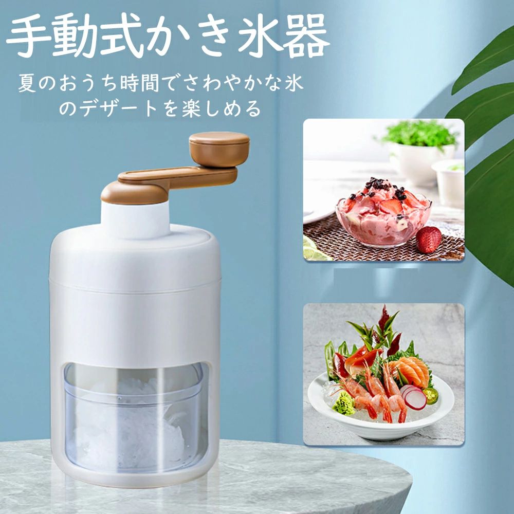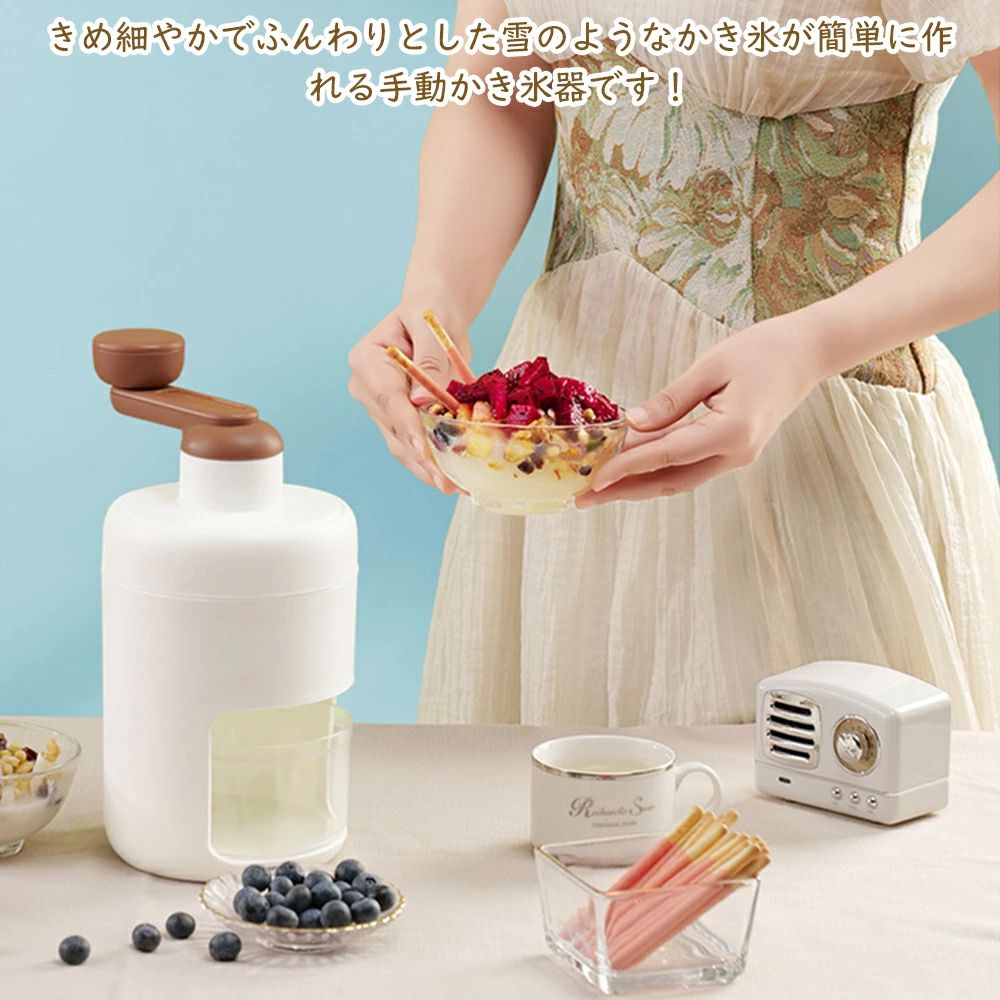 商品情報【商品情報】【手動かき氷器で自宅で楽しむフワフワ台湾風かき氷!】きめ細やかでふんわりとした雪のようなかき氷が簡単に作れる手動かき氷器です!大人も子供も楽しめる家庭用のかき氷器なので、おうちでのリラックスタイムやアウトドアでの楽しみにも最適です!【さまざまなスイーツを作りましょう!】定番のかき氷はもちろん、牛乳やジュースを凍らせて味付けした氷や、冷凍フルーツも簡単に削ることができます!かき氷の上には、ヨーグルトやプリンなどお好きなトッピングをのせてお楽しみください!【手動式でDIYの達成感を味わいましょう】手動かき氷器はハンドルを回すことでスピードや圧力を微妙にコントロールできます。自分で回すことで、出来上がったかき氷の達成感を感じることができますし、お子さんと一緒に楽しみながら作ることもできますので、手動かき氷器の魅力ですね!【バラ氷や冷凍フルーツに対応】専用製氷カップが付属しているだけでなく、バラ氷も簡単に削ることができます。市販のバラ氷をそのままに削ることができるのです。さらに、冷凍いちごやマンゴなどの冷凍フルーツもスムーズに削ることができますので、お好きなスイーツをお楽しみください!【簡単な構造で取り外して水洗い可能】手動かき氷器は組み立てが簡単で、部品を取り外すことができます。使用後は本体のモーター以外の部品を水洗いして清潔に保ち、乾燥した布でしっかり拭いて収納してください。手軽にお手入れができるので、いつでも清潔な状態でご使用いただけます。【サイズ】本体:13cm×13cm×26cm【材質】ABS+ステンレス鋼【使い方】付属の製氷カップで作った氷をケースに入れてハンドルを横に回すだけ!手回しすることで、自分のペースでかき氷を作ることができます。【注意事項】●ご使用後は、刃やその他金属部分がサビないように、しっかり乾いた布で水分を拭き取り、乾燥させてから収納してください。●水気や汚れが付着したままや、異種金属と接触させたまま放置しないでください。●手や指などを傷つけないよう、刃には十分気をつけてください。●お子様の手の届かない場所に保管してください。●本製品は食器洗い機には対応しておりません。●本体の用途以外にお使いにならないでくださ。●氷を入れる際、及びお手入れの際に刃にふれない。●分解、修理、改造をしない。●強い衝撃や振動を加えたり、落としたりしない。●お子様一人で使用させない。●専用製氷カップに水をいれすぎない。●専用製氷カップに水以外のものを入れない。●冷凍庫からだした氷をすぐに素手で触れない。●氷を専用製氷カップから取り出すとき、カップをたたきつけない。メーカー希望小売価格はメーカーサイトに基づいて掲載しています手動アイスクラッシャー アイスシェーバー かき氷器 かき氷機 手動式 砕氷機 小型製氷機 氷粉砕 ステンレス鋼刃 鋭い 高効率 滑り止め 使用簡単 携帯便利 水洗い可能 夏 家庭用 飲食店 調理器具 夏休み 製氷カップ 氷用容器 電池不要 カンタン操作 【2024新品】送料無料 おウチでふわふわかき氷! かき氷器 かき氷機 DIY 手動式 砕氷機 アイスシェーバー 小型製氷機 氷粉砕 氷用容器 5