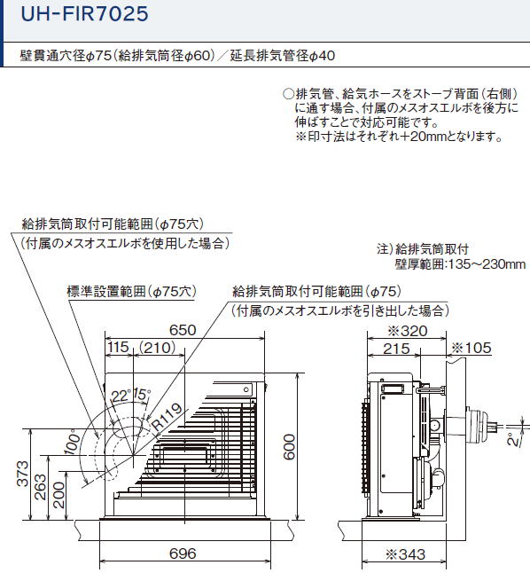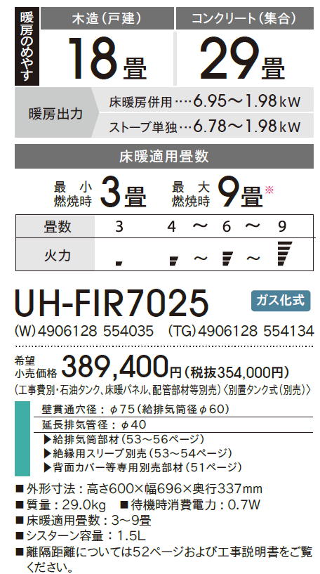 ・CORONA フィルネオ FF式床暖房石油暖房機 UH-FIR7025 ・シャンパンホワイト(W) ・暖房のめやす 木造18畳まで コンクリート29畳まで ・床暖適用畳数 最小燃焼時3畳 最大燃焼時9畳 ・希望小売価格 389,400円(税込) ・工事費別・石油タンク、床暖パネル、配管部材等別売)〈別置タンク式(別売)〉 ・ 壁貫通穴径 : φ75(給排気筒径φ60) ・延長排気管径 : φ40 ◆絶縁用スリーブ別売 ◆背面カバー等専用別売部材 ■外形寸法 : 高さ600×幅696×奥行337mm ■質量 : 29.0kg ■待機時消費電力 : 0.7W ■床暖適用畳数 : 3~9畳 ■シスターン容量:1.5L ・石油タンク別置式(別売) ・背面カバー別売日頃よりSTOVESをご利用いただきましてありがとうございます。 ご注文される前に、下記「※ご注文される前にお読み下さい。」の内容を確認下さい。