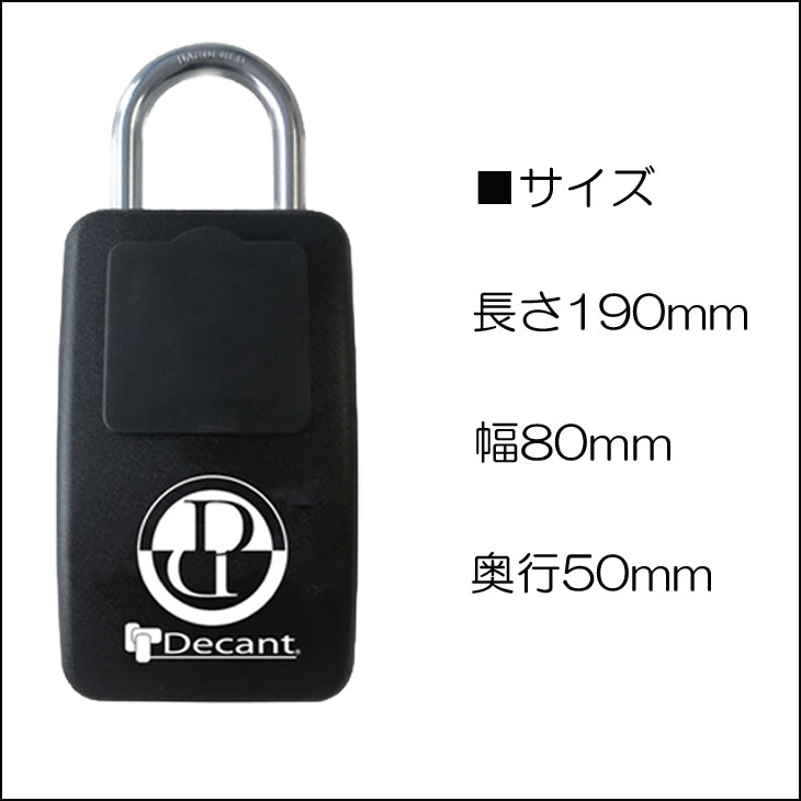 DECANT デキャント DECANT KEYLOCKER NEO 車の電子キーやガレージの鍵等を安全に保管できるBOX型キーロッカー。 ■商品詳細■ ■品番:KEY LOCKER ・素材:プラスチック ・大容量の収納スペース。 ・設置する場所に傷が付きにくいプラスチックカバー。 ・ダイヤル部分にカバーが付いた事で、ダイヤル部分を水や埃などから守ります。 ・付属のアルミパックを使用すればスマートキーにも対応可能。 (機種によって対応できない場合もあります。) ■カラー ・BLK(ブラック) ■サイズ ・長さ190mm×幅80mm×奥行50mm(掛け金含む) ※こちらの商品は小型宅配便での発送となります。 ※クレジットカード/銀行振り込み/楽天(etc)決済など、15時までに決済完了の場合は即日発送!(※15時以降の決済確認は翌日以降ご入金確認後の発送) ○デザイン、仕様、価格等、予告なしに変更となる場合があります。ご了承ください。 ○掲載商品の色は、できる限り現品と同じになるよう努めておりますが、ご使用のパソコン環境により多少色合いが異なる場合がございます。著しい色の相違は御座いませんのでご安心ください。 ○お急ぎのお客様は、ご確認していただく事をお勧め致します。