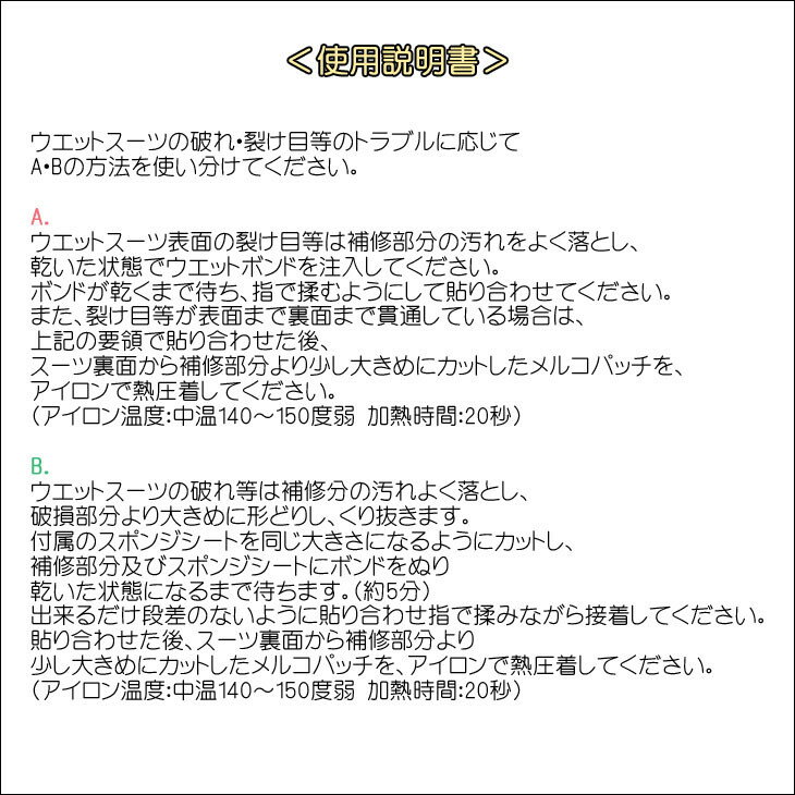 WET SUITS REPAIR KIT ウエットスーツボンドとネオプレーン生地と アイロン転写補強シートがセットになった簡易修理キットです。 ■タイプ:ジャージ/ラバー ■【ジャージ素材】両面ジャージ ■【ラバー素材】片面ラバー・片面ジャージとなっております。 ■SIZE: ネオプレーンの寸法:【縦:約10cm×横:約15cm】 ラバーパット及びジャージパットの寸法:どちらとも正方形なので【縦横:約10cm】 <使用説明書> ウエットスーツの破れ・裂け目等のトラブルに応じてA・Bの方法を使い分けてください。 A. ウエットスーツ表面の裂け目等は補修部分の汚れをよく落とし、乾いた状態でウエットボンドを注入してください。 ボンドが乾くまで待ち、指で揉むようにして貼り合わせてください。 また、裂け目等が表面まで裏面まで貫通している場合は、上記の要領で貼り合わせた後、 スーツ裏面から補修部分より少し大きめにカットしたメルコパッチを、アイロンで熱圧着してください。 (アイロン温度:中温140〜150度弱 加熱時間:20秒) B. ウエットスーツの破れ等は補修分の汚れよく落とし、破損部分より大きめに形どりし、くり抜きます。 付属のスポンジシートを同じ大きさになるようにカットし、 補修部分及びスポンジシートにボンドをぬり乾いた状態になるまで待ちます。(約5分) 出来るだけ段差のないように貼り合わせ指で揉みながら接着してください。 貼り合わせた後、スーツ裏面から補修部分より少し大きめにカットしたメルコパッチを、アイロンで熱圧着してください。 (アイロン温度:中温140〜150度弱 加熱時間:20秒) *補修される場合5cm四方以上のものはメーカーでの修理をお願いします。 注意:ポリプロピレン・ポリオレフィンを含む素材(ジャージ)に対しては、溶解温度が130度未満の為、使用しないでください。 (ウエットスーツを焦がす恐れがあります。) 品質表示をよく確認した上でのご使用をお願い致します。 ※クレジットカード/銀行振り込み/楽天(etc)決済など、15時までに決済完了の場合は即日発送!(※15時以降の決済確認は翌日以降ご入金確認後の発送) ○デザイン等、予告なしに変更となる場合があります。ご了承ください。 ○掲載商品の色は、できる限り現品と同じになるよう努めておりますが、ご使用のパソコン環境により多少色合いが異なる場合がございます。著しい色の相違は御座いませんのでご安心ください。 〇商品ページに記載のカラー表記ですが、カタログやJANコード作成時などにメーカーで割り当てたカラー表示となり実際の商品と色味が異なる場合がございますが予めご了承下さい。 〇また柄物商品の場合などは、商品により柄の位置や入り方に個体差が生じてしまいます。商品ページの写真とイメージが異なる場合がございますが予めご了承下さい。 ○お急ぎのお客様は、ご確認していただく事をお勧め致します。 ※コチラの商品は小型宅配便での発送となります。 『翌日配送(あす楽対応)、日時指定、代引き可能』となりますが送料込みの値段となりますのでご了承下さい。