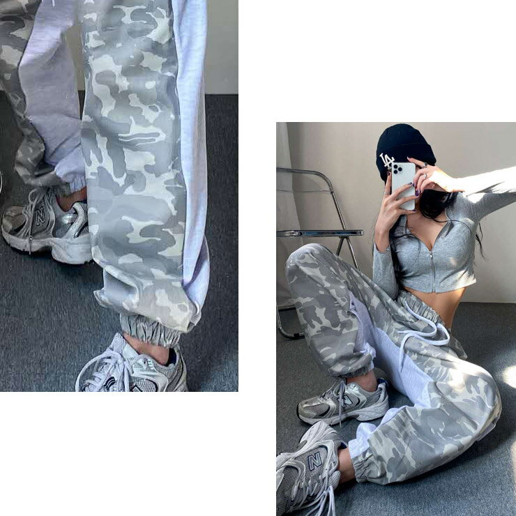 K-collection ケイコレクション レディース ナイロン パンツ ロングパンツ ジョガー カモフラ ファッション エクササイズ フィットネス ジム スポーツ ダンス ヨガ 韓国 ユニセックス ミリタリーカモ ブラック グレー