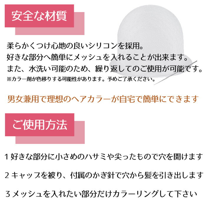 柔らかくつけ心地の良いシリコンを採用。 好きな部分へ簡単にメッシュを入れることが出来ます。 また、水洗い可能のため、繰り返してのご使用が可能です。 ※カラー剤が色移りする可能性があります。予めご了承ください。 【使用方法】 好きな部分に小さめのハサミや尖ったもので穴を開けてください。 キャップを被り、かぎ針で穴から髪を引き出します。 メッシュを入れたい部分だけカラーリングが可能です。【※メーカーにてパッケージがリニューアルされる場合がございます。その際の返品・交換はお受けしかねますので、ご了承の上ご購入ください※】●お取り寄せ商品につきまして● ご注文後のキャンセルはお受けする事ができませんため、必ず納期時期の確認と商品をお間違えのないようご確認下さい。 また急遽メーカー欠品や製造中止となりご用意ができなくなる場合がございます。 その際は代替品のご提案やご注文をキャンセルさせて頂く場合がございます。