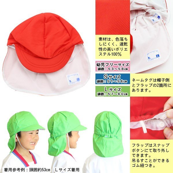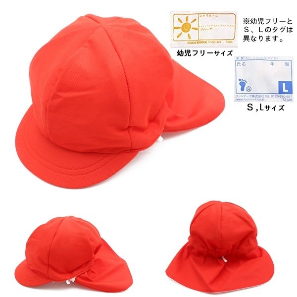 FOOTMARK ふっとマーク フラップ付き 体操帽子 日よけ付き 101215 保育園 幼稚園 小学校 カラー帽子 赤白帽 運動会 学校 体育日よけがついた体操帽子!●商品説明:お子様を紫外線から守る日よけ付きの体操帽子です。カラーは全14色!サイズは3サイズの片方の面の色は白色です。素材は、お洗濯しても色落ちがしにくい速乾性のあるポリエステル100%ツバはやわらかいソフトタイプです。ネームタグは、帽子側とフラップ側の2箇所についています。※幼児フリーサイズはネームタグのデザインが異なります。フラップはスナップボタンで取り外しが可能。後ろ側にはフック等につりさげられるゴム紐もついてます。※こちらのサイズより大きいサイズは別ページにて販売しております。幼稚園、学校での体育や運動会等で使われています。こちらの商品は基本的にご注文後の取り寄せとしております。商品発送まで2-4営業日いただきますので、あらかじめご了解ください。●カラー:001ホワイト002イエロー003ピンク004オレンジ005レッド006サックス007グリーン010ブルー011エンジ012ムラサキ013ワカクサ019ノーコン022レモン240ローズ※裏面はホワイトです。●サイズ:幼児フリー(頭囲:53-58cm)Sサイズ(頭囲:51-56cm)Lサイズ(頭囲:57-60cm)※商品タグ記載サイズ●素材:ポリエステル100%
