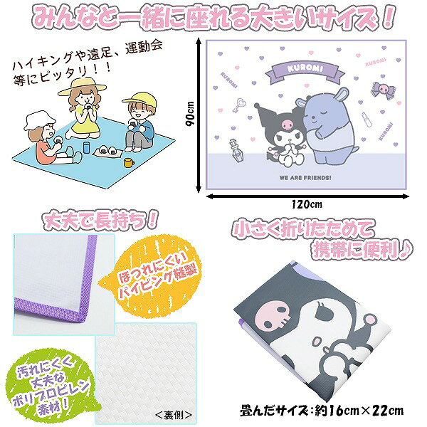 クロミ ちゃん マイメロ マイメロディ サンリオ レジャーシート 120cm × 90cm 男 2人 3人 遠足 アウトドア ピクニック プール 子供 運動会 ハイキング お花見かわいいクロミのレジャーシート!●商品説明:かわいいキャラクターレジャーシート!みんなと一緒に座れる(2〜3人)大きいサイズ。素材は汚れにくく、丈夫なポリプロピレンを採用。お花見・BBQ・海水浴・運動会・ハイキング・遠足など、アウトドアシーンで大活躍のレジャシート。コンパクトに畳めて、お子様のリュックにもスッポリ入る。※畳んだサイズ:約16cm×22cm生産地:中国●カラー:クロミ●サイズ:広げたサイズ:約120cm×90cm※畳んだサイズ:約16cm×22cm●素材:ポリプロピレン