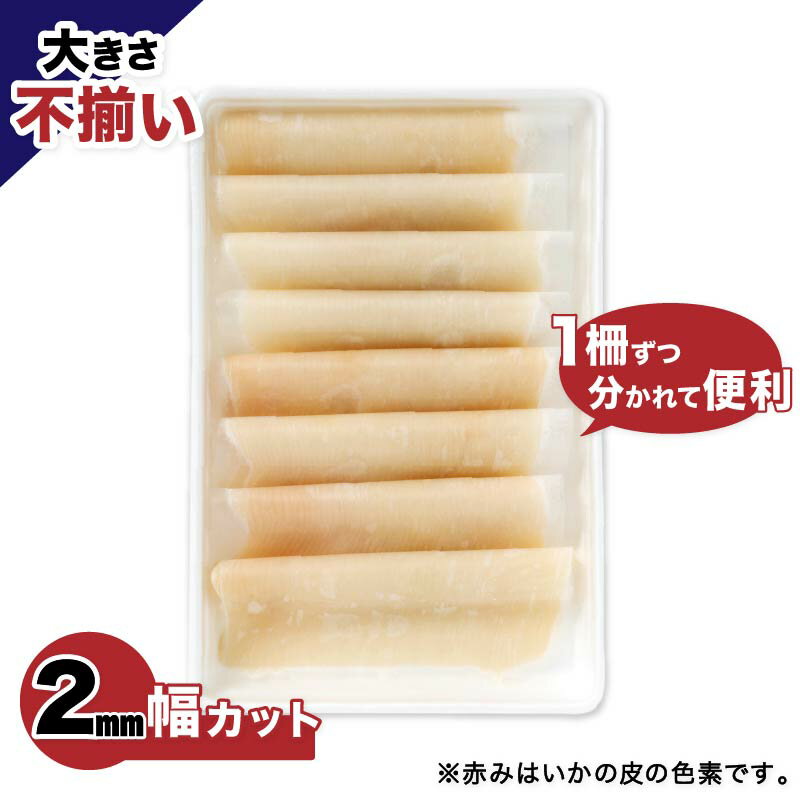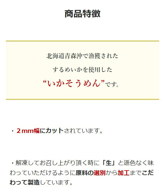 商品説明 北海道・青森沖で漁獲されたするめいかを使用した「いかそうめん」です。 名称 [理由あり]いかそうめん 原材料名 するめいか(北海道・青森県沖太平洋産)、(一部にいかを含む) 内容量 いかそうめん(8柵)× 1パック 栄養成分表示(100gあたり)※推定値 エネルギー:85kcalたんぱく質:18.6g脂質:0.6g炭水化物:0.1g食塩相当量:0.5g 保存方法 要冷凍(-18℃以下) 賞味期限 冷凍2026年5月以降※解凍後は2日(要冷蔵) 配送方法 ヤマト運輸(クール冷凍) 加工地 北海道室蘭市