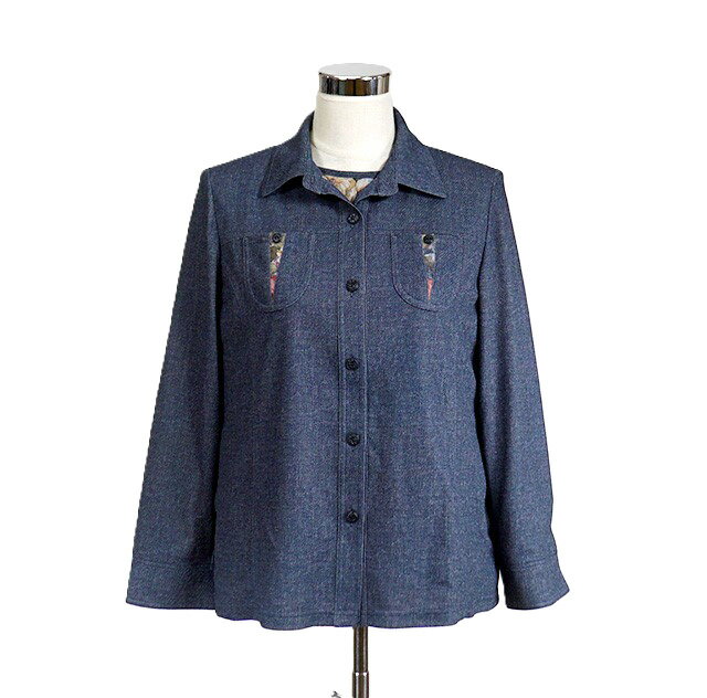 <2点セット>デニム&花柄で着映える♪ デニム調プリントジャケットアンサンブル ジャケット+花柄プリントプルオーバー(M LL)ネイビー