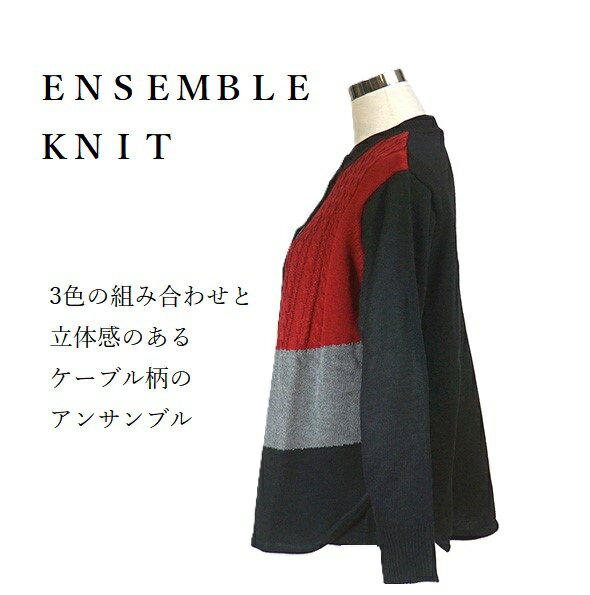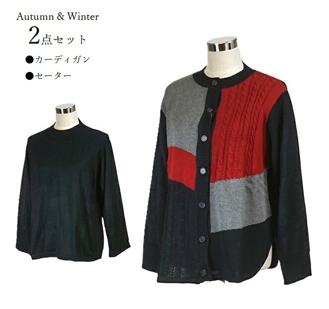 大きいサイズ<2点セット>着回し自在!セーター+カーディガン 配色切替 ケーブル柄 ニットアンサンブル(3L|4L)レッド/ブラック
