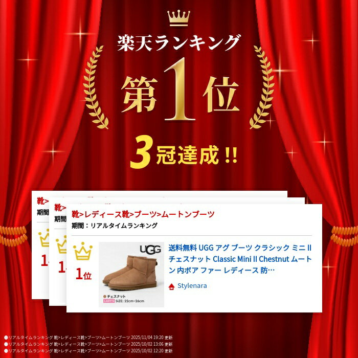 メーカー名 : UGG(アグ) 商品名 : Classic Mini II カラー : CHESTNUT 素材 : ・表地: ツインフェイスシープスキン Twinface sheepskin ・ソール: ラバー EVA ・裏地: シープスキン Sheepskin サイズ : US5.0(22cm)~US9.0(26cm) 原産地 : 外国産(ベトナム/フィリピン/中国) 広告 文責 : 株式会社 JABLE(06-6796-9667) ※UGGご購入時の注意事項※ こちらの商品は、並行輸入により海外から輸入しております。 当店からの発送までに1~2週間のお時間いただいております。 製造・入荷時期により、細かい仕様の変更がある場合がございます。 上記を予めご理解の上、お買い求め下さいませ。 ※並行輸入品の為輸送時に出来た箱傷みが見られることがございますが、良品として販売しております。あらかじめご了承くださいませ。 ※輸入時より目立たない程度の微細な傷、汚れ、スレ、シワなどの跡がついている場合がありますが、素材上の性質とご了承下さい。 製品特有のシワやキズ等をお気になさる方はご遠慮ください。 ※ご覧になっているモニターの色の違いにより、実際の商品と色合いが異なる場合がございます。