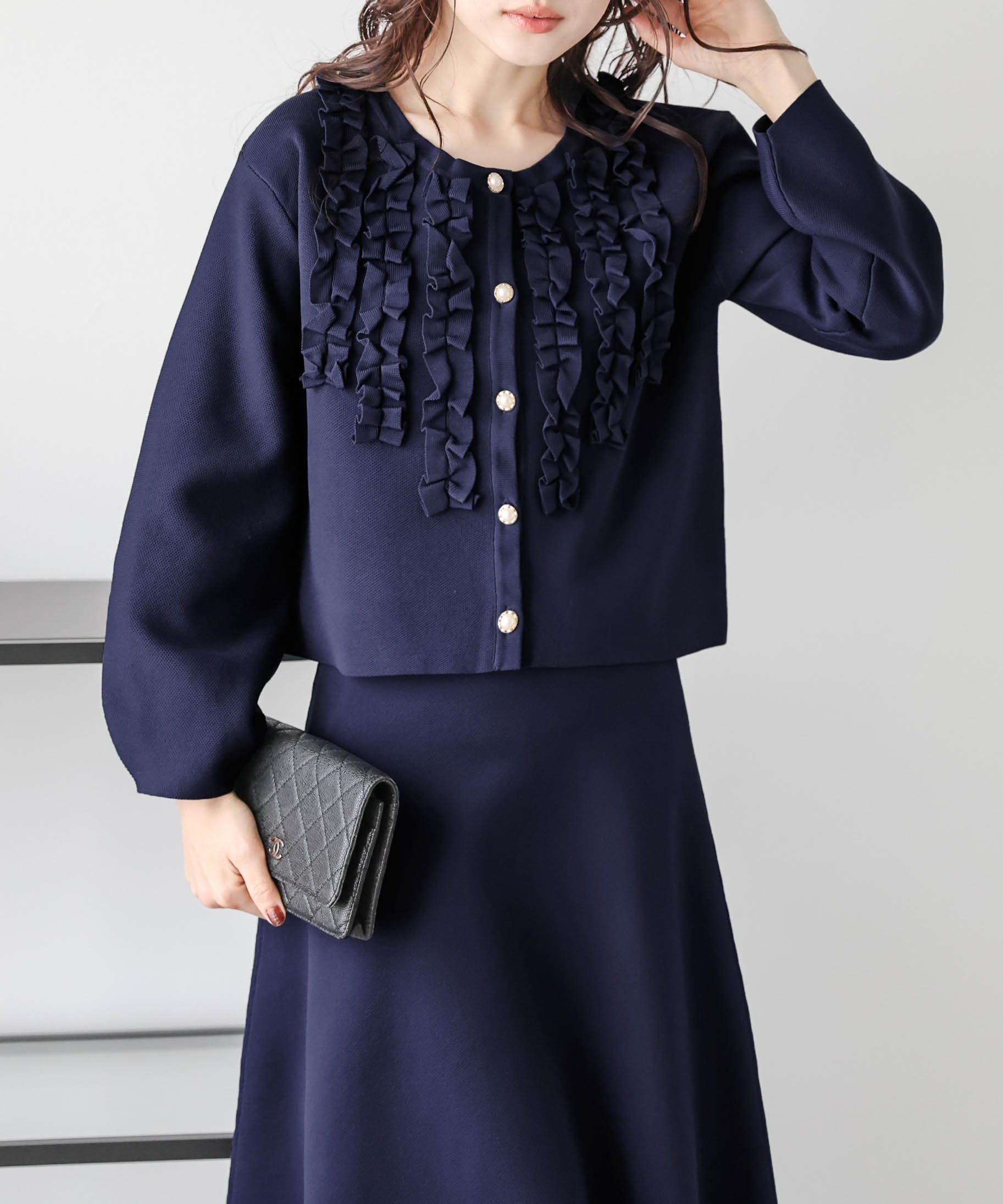 Lajour(ラジュール)胸元フリルスカートセットアップ胸元フリル+パールボタンで華やぐ大人フェミニンにキマるセットアップトップスは胸元にたっぷりとフリルをあしらい、きらめくパールボタンが上品さをプラス。程よく丸みのある袖のシルエットが、女性らしい柔らかな雰囲気に◎スカートはふんわり広がるミディ丈のAラインフレアシルエット。それぞれ単体でも着られるデザインで、普段使いにもおすすめです。Point01たっぷりフリル×きらめくパールボタン胸元にたっぷりとフリルを敷き詰め、上品に輝くパールボタンがお顔周りを華やかに演出します。Point02華奢見えデザインで、スタイルアップ自然と脚が長く見える程よくコンパクトな丈感のトップス。スカートはふわっと広がったAラインシルエットで、気になるお尻や太ももの体型カバーも叶えます。■Fabricほどよい厚みで伸縮性のある軽やかなアクリルニット生地。毛羽感がなく、さらりとした質感洗濯機で簡単に洗えるウォッシャブル生地を使用。手軽にお洗濯できるので、いつも清潔にご着用いただけます。※お洗濯の際は、ネットに入れて「弱水流」または「手洗いコース」等、もしくは手洗いでやさしく押し洗いでお手入れしていただけます。---------------------透け感:なし裏地:なし厚さ:普通伸縮性:あり---------------------型番:asess25-1054-004-506 NV2297【採寸】トップス【フリー】バスト:98cm / 肩幅:44cm / 総丈:49cm / 袖丈:48cm / 裾幅:46cmスカート【フリー】ウエスト:62cm / ヒップ:98cm / 総丈:73cm / 裾幅:86cm商品のサイズについて【商品詳細】中国素材:アクリル100%サイズ:フリー※画面上と実物では多少色具合が異なって見える場合もございます。ご了承ください。商品のカラーについてLajour(ラジュール)胸元フリルスカートセットアップ胸元フリル+パールボタンで華やぐ大人フェミニンにキマるセットアップトップスは胸元にたっぷりとフリルをあしらい、きらめくパールボタンが上品さをプラス。程よく丸みのある袖のシルエットが、女性らしい柔らかな雰囲気に◎スカートはふんわり広がるミディ丈のAラインフレアシルエット。それぞれ単体でも着られるデザインで、普段使いにもおすすめです。Point01たっぷりフリル×きらめくパールボタン胸元にたっぷりとフリルを敷き詰め、上品に輝くパールボタンがお顔周りを華やかに演出します。Point02華奢見えデザインで、スタイルアップ自然と脚が長く見える程よくコンパクトな丈感のトップス。スカートはふわっと広がったAラインシルエットで、気になるお尻や太ももの体型カバーも叶えます。■Fabricほどよい厚みで伸縮性のある軽やかなアクリルニット生地。毛羽感がなく、さらりとした質感洗濯機で簡単に洗えるウォッシャブル生地を使用。手軽にお洗濯できるので、いつも清潔にご着用いただけます。※お洗濯の際は、ネットに入れて「弱水流」または「手洗いコース」等、もしくは手洗いでやさしく押し洗いでお手入れしていただけます。---------------------透け感:なし裏地:なし厚さ:普通伸縮性:あり---------------------型番:asess25-1054-004-506 NV2297【採寸】トップス【フリー】バスト:98cm / 肩幅:44cm / 総丈:49cm / 袖丈:48cm / 裾幅:46cmスカート【フリー】ウエスト:62cm / ヒップ:98cm / 総丈:73cm / 裾幅:86cm商品のサイズについて【商品詳細】中国素材:アクリル100%サイズ:フリー※画面上と実物では多少色具合が異なって見える場合もございます。ご了承ください。商品のカラーについてこの商品は先行予約商品のため返品・交換対象外です詳細はこちら >>