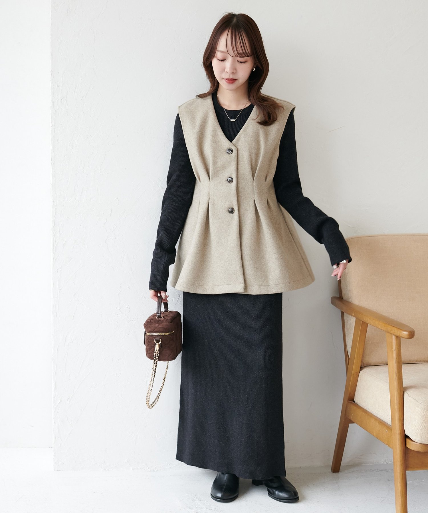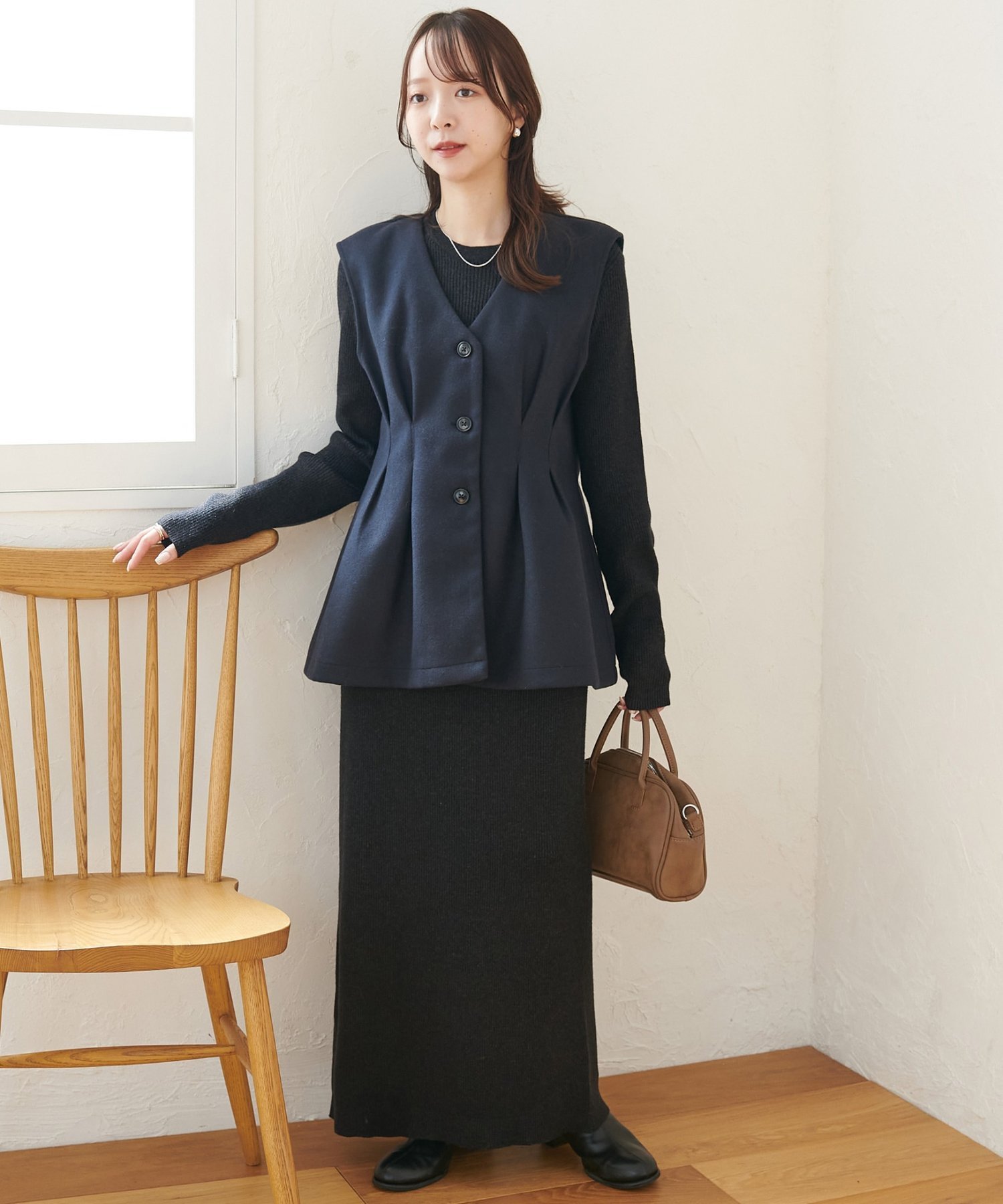 Discoat(ディスコート)【褒められ確定!/3点セット】ペプラムジレ付マルチウェイセットアップ女性らしいペプラムシルエットのジレが主役のマルチウェイセットアップ。●デザイントップス・ジレ・スカートの3点がセットになった着回し力抜群の3点セットアイテム。それぞれ単品でも着用でき、シーンや気分に合わせたスタイリングを楽しめます♪サイズはFサイズと小柄な方にぴったりのPSサイズごを用意しました!※モカ・ネイビーはWEB限定カラーとなっております。※チャコールグレーとダークグレーですが、ジレのカラーは同じでワンピースの色のみ異なります。ートップスーシンプルで着回しやすいクルーネックニットプルオーバー。リブ編みにしたことで、身体のラインを拾いにくいのがポイント!伸縮性も高く、着脱しやすいです。程よくコンパクトな着丈で、ボトムスにインでもアウトでもバランスよく着用できます!ースカートー体のラインを拾いすぎないリブ編みで、すっきりとしたシルエットを演出。ウエストは総ゴム仕様になっており、長時間の着用でも締め付け感がなく快適に過ごせます!裾にはスリットが施され、後ろ姿に抜け感をプラスしてくれるアイテム◎ージレーウエストにタックを入れることで自然な広がりを持たせ、スタイルアップ効果を演出。やや長めの丈感で腰まわりをさりげなくカバーしてくれるのも嬉しいポイントです◎Vネックにしたことで、顔回りがスッキリとした印象に◎クルーネックからタートルネックまで幅広いレイヤードスタイルが楽しめます♪●素材トップスとスカートは伸縮性のあるリブニット素材ベストは暖かみのある素材感※ラメ糸とは使用しておりませんが、トップス・スカートの表面は少し光沢感のあるポリエステル糸を使用しております。***********************洗濯方法:トップス・スカート(手洗い可)、ジレ(ドライクリーニング)裏地:なし透け感:なし伸縮性:トップスとスカートのみあり光沢感:なし生地の厚さ:普通***********************●スタイリング3点セットで着ると、統一感のある上品なコーディネートに。ジレを外せばシンプルなニットセットアップとして、ジレ単体をデニムやワンピースに重ねて着回すのもおすすめ◎オン・オフ問わず、シーンや気分に合わせて自由に着こなしを楽しめるセットアップです。▼おすすめのスタイリングアイテムあったかトロミイージーパンツ《WEB限定カラーあり》USコットンデニムセミフレアパンツリブ袖口ボタンタートル《WEB限定カラーあり》フロッキーメッシュロングスリーブ《WEB限定カラーあり》●STAFF着用コメント149cmスタッフ(PSサイズ着用):ジレはヒップまでしっかり隠れる丈感で、腰まわりをさりげなくカバーしてくれます。スカートにはバックスリットが入っているので足捌きもしやすいです◎155cmスタッフ(Fサイズ着用):どのアイテムも持っているものと合わせやすいのが一番うれしい!そのままできると、キレイメな雰囲気でお出掛けコーデとしてぴったりです◎一点アイテムを変ええるだけでも雰囲気が変わるので、着回しは無限大♪162cmスタッフ(Fサイズ着用):スカートは足首が見えるくらいの丈感で、ブーツとも相性◎それぞれ単品でも使いやすく、着回し力抜群のセットです!【PSサイズ】Sサイズよりコンパクトなサイズ感なので小柄な方や、低身長の方におすすめです。【サイズ】(ジレ)Fサイズ 総丈:67.5cm 胸囲:112.4cm 肩幅:42cmPSサイズ 総丈: 62cm 胸囲:104cm 肩幅:40.5cm(トップス)Fサイズ 総丈: 55cm 肩幅:34cm 胸囲: 89cm 袖丈:64cmPSサイズ 総丈: 53cm 肩幅: 31cm 胸囲:84cm 袖丈:58cm(スカート)Fサイズ ウエスト:70ー100cm ヒップ:84cm 総丈:88cmPSサイズ ウエスト:66ー98cm ヒップ:80cm 総丈:84cm▼シリーズもございます。ベスト付マルチウェイセットアップ《WEB限定カラーあり》ご紹介したインスタライブはこちらをタップしていただくとご覧いただけます♪【お取り扱いの注意】※着用時、洗濯時は必ず取り扱い表示・タグをご確認の上、お取り扱いください。(トップス・スカート)・手洗い:30℃まで(手洗いは短時間で軽く押し洗いをしてください。)・洗濯ネットを使用してください。・手洗いの際は、他の物と分けて単独で洗ってください。・漂白:不可・タンブル乾燥:不可・アイロン:低温120℃まで(アイロンの際は、当て布をして軽く当ててください。)・ドライクリーニング:可能・ウエットクリーニング:可能・素材の特性上、色や風合い、サイズ等に多少のばらつきがあります。・素材の特性上、洗濯により縮みやねじれ等が生じることがあります。(ジレ)・ドライクリーニング:石油系溶剤 弱い処理・クリーニングの際は、洗濯ネットを使用してください。・クリーニング後は、必ずカバーを外して風通しの良いところで乾燥し、着用・保管してください。・家庭洗濯:不可・漂白:不可・タンブル乾燥:不可・アイロン:低温120℃まで(アイロンの際は、当て布をして軽く当ててください。)・汗や水、摩擦により他のものに色移りすることがあり