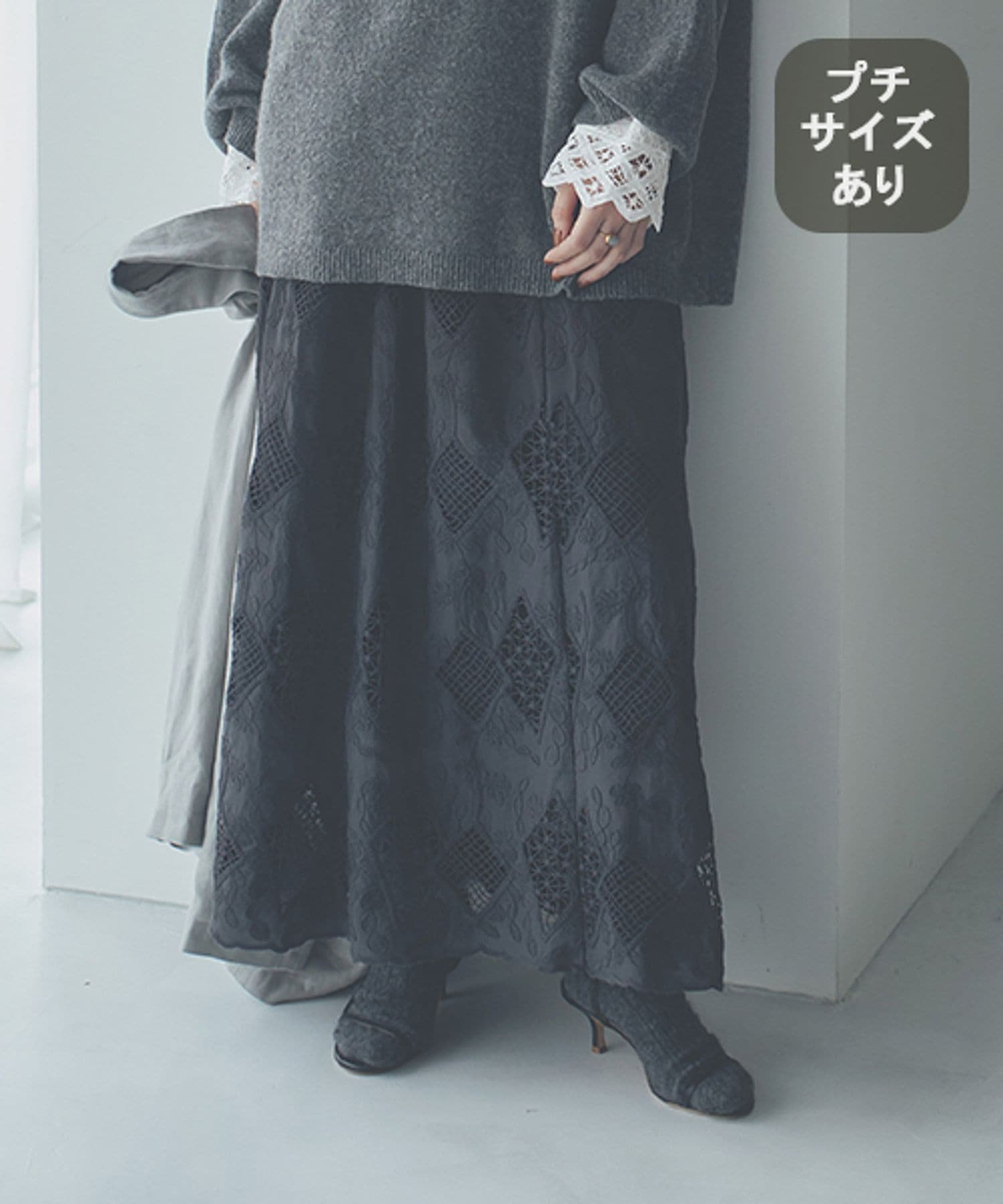 studio CLIP(スタディオクリップ)《natural by clip》カットワークレーススカート[プチサイズあり]刺繍とカットワークの豪華なデザイン華やかな印象のレーススカートーーー【素材】カットワーク刺繍生地を使用。生地全体に刺繍とカットワークが入り華やかな印象です。【デザイン】コーデの主役にぴったりなロング丈のレーススカート。華やかな印象なので、暗くなりがちな秋冬のコーデを明るく見せてくれます。裾がスカラップになっているところもさりげないデザインポイントです。ーーー【スタイリング】スカートを主役に、ニットやスウェットなどオーバーサイズのトップスを合わせていただくのがおすすめ◎ワンピースの下にレイヤードして裾からのぞかせるスタイリングも素敵です。型番:604026-11-09 QS1616【採寸】F(09)総丈91 ウエスト66 裾幅97.5 ウエスト最大118低身長さん向けプチ(WEB限定)(74)総丈84 ウエスト66 裾幅97.5 ウエスト最大118商品のサイズについて【商品詳細】CHINA素材:表地:綿100% 刺繍糸:綿100% 裏地:ポリエステル80% 綿20%サイズ:F、低身長さん向けプチ(WEB限定)洗濯機洗い可(ネット使用)※画面上と実物では多少色具合が異なって見える場合もございます。ご了承ください。商品のカラーについてstudio CLIP(スタディオクリップ)《natural by clip》カットワークレーススカート[プチサイズあり]刺繍とカットワークの豪華なデザイン華やかな印象のレーススカートーーー【素材】カットワーク刺繍生地を使用。生地全体に刺繍とカットワークが入り華やかな印象です。【デザイン】コーデの主役にぴったりなロング丈のレーススカート。華やかな印象なので、暗くなりがちな秋冬のコーデを明るく見せてくれます。裾がスカラップになっているところもさりげないデザインポイントです。ーーー【スタイリング】スカートを主役に、ニットやスウェットなどオーバーサイズのトップスを合わせていただくのがおすすめ◎ワンピースの下にレイヤードして裾からのぞかせるスタイリングも素敵です。型番:604026-11-09 QS1616【採寸】F(09)総丈91 ウエスト66 裾幅97.5 ウエスト最大118低身長さん向けプチ(WEB限定)(74)総丈84 ウエスト66 裾幅97.5 ウエスト最大118商品のサイズについて【商品詳細】CHINA素材:表地:綿100% 刺繍糸:綿100% 裏地:ポリエステル80% 綿20%サイズ:F、低身長さん向けプチ(WEB限定)洗濯機洗い可(ネット使用)※画面上と実物では多少色具合が異なって見える場合もございます。ご了承ください。商品のカラーについて
