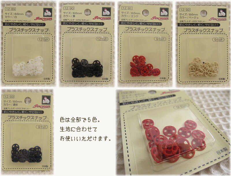 金属アレルギーの方にもやさしいプラスチック製のスナップ【プラスチックスナップ】です。 軽く、サビない、そして肌にもやさしいので、 肌の弱い方や、赤ちゃんにもお使いただけます。 ★サイズ&入り数 8.6mm 白・黒 12セット入り エンジ・ベージュ・濃紺 9セット入り ★品質表示 ポリアセタール
