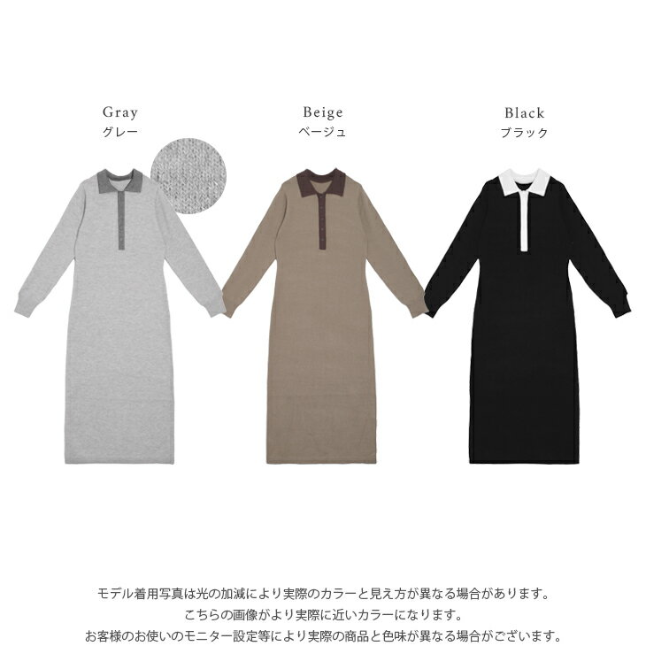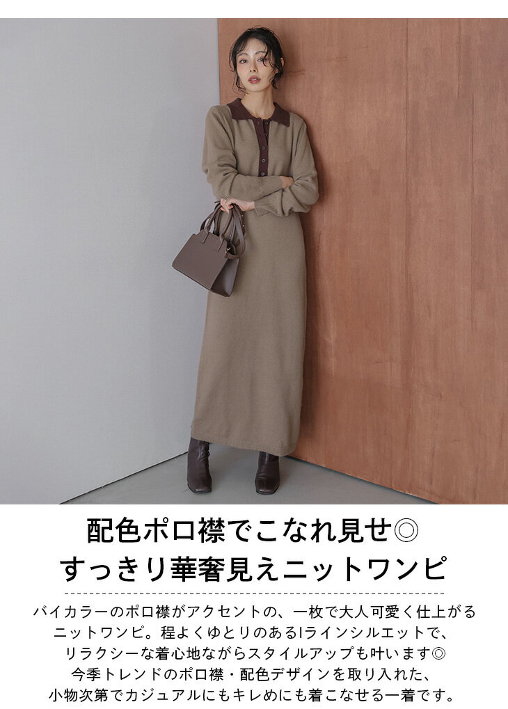 【25AW×半額クーポン】ニットワンピース ポロ襟 配色デザイン バイカラー 襟付き ロングワンピース Iラインシルエット シンプル 長袖 大人 レディース 秋冬【lswpaw25-1582】【予約販売:12月4日入荷予定順次発送】【送料無料】宅込